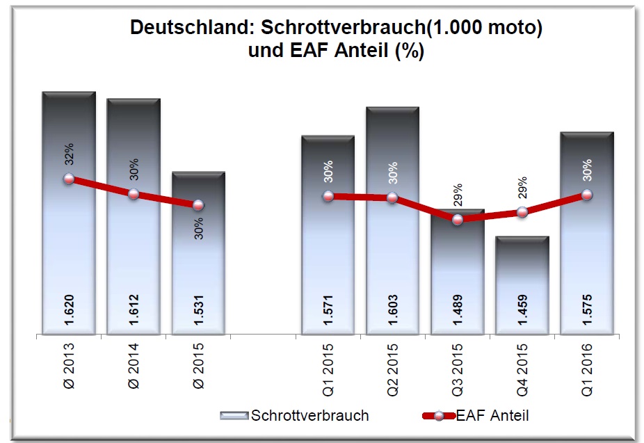 Quelle: amtliche Ausfuhrstatistiknfalls rückläufig, allerdings nicht in dem Maße wie die Exporte. Im Januar 2016 stieg sie sogar leicht an. Die Ursache hiefür liegt in dem ebenfalls rückläufigen Import von Stahlschrott nach Deutschland, der 2015, verglichen mit 2014, um rund 15% zurückgegangen ist. Gründe für den Rückgang der Stahlschrottexporte sind weiterhin in der Konkurrenzsituation mit billigen Halbzeugprodukten, aber auch Fertigprodukten, beispielsweise aus China, zu finden. Bei den rückläufigen Importen von Stahlschrott spielt natürlich auch die Rohstahlerzeugung Deutschlands eine tragende Rolle.