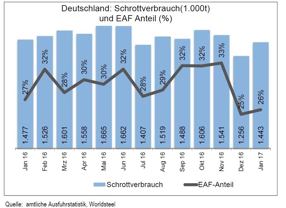 In der EU habe der Stahlschrottverbrauch 2016 etwa 2 Prozent unter dem Vorjahresergebnis gelegen. Im Januar sei er weiter zurückgegangen, habe aber noch leicht über dem Vorjahreswert gelegen. Bis November seien die Schrottexporte hingegen deutlich angestiegen und hätten um 42 Prozent über dem Vorjahreszeitraum gelegen, während die Importe auf etwa gleichem Niveau geblieben wären. Dies sei laut WV Stahl mit dem Rückgang der Rohstahlerzeugung, dem weiterhin massiven Importdruck durch Drittländer sowie den schwierigen Exportbedingungen für Fertigprodukte in Folge handelpolitischer Maßnahmen in Drittstaaten zu begründen. Daher werde den außenpolitischen und wirtschaftlichen Rahmenbedingungen 2017 eine besondere Bedeutung zukommen.