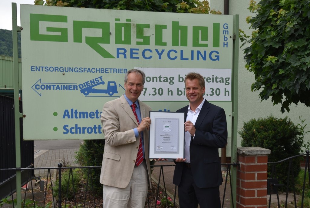 Seit zehn Jahren ist die Firma "Gröschel Recycling GmbH" Entsorgungsfachbetrieb. Dieses Jubiläum nahm Geschäftsführer Jörg Lacher zum Anlass, dem Geschäftsführer Ulf-D. Hennies die Ehrenurkunde der bvse-Entsorgergemeinschaft zu überreichen.