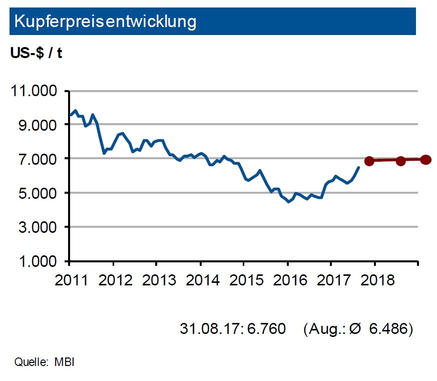 Die Preise seien im August stark angezogen, insgesamt um etwa 500 Dollar pro Tonne. Dies sei zum einen in einer Erholung der physischen Nachfrage in China begründet, zum anderen durch eine verstärkte investive Nachfrage. Bis Jahresende rechnet die IKB mit einem Preis von 6.500 US-Dollar pro Tonne mit einem Band von 600 US-Dollar um die Marke.