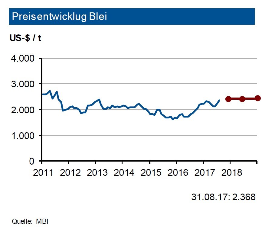 Eine hohe Nachfrage bei einem nur geringen Anstieg der Raffinadeproduktion führe zu höheren Zinkpreisen. Bis Jahresende rechnet die IKB mit einem Preis von 3.100 US-Dollar pro Tonne mit einer Bandbreite von 500 US-Dollar. Ähnlich sehe die Entwicklung bei Blei aus, wo der Verbrauch sogar um 10 Prozent zunahm. Nachdem sich im ersten Halbjahr bereits ein Angebotsdefizit von 80.000 Tonnen ergeben habe, erwartet die IKB für das Gesamtjahr ein Defizit von 100.000 Tonnen. Der Bleipreis wird zum Jahresende bei 2.300 US-Dollar pro Tonne mit einer Bandbreite von 400 US-Dollar.