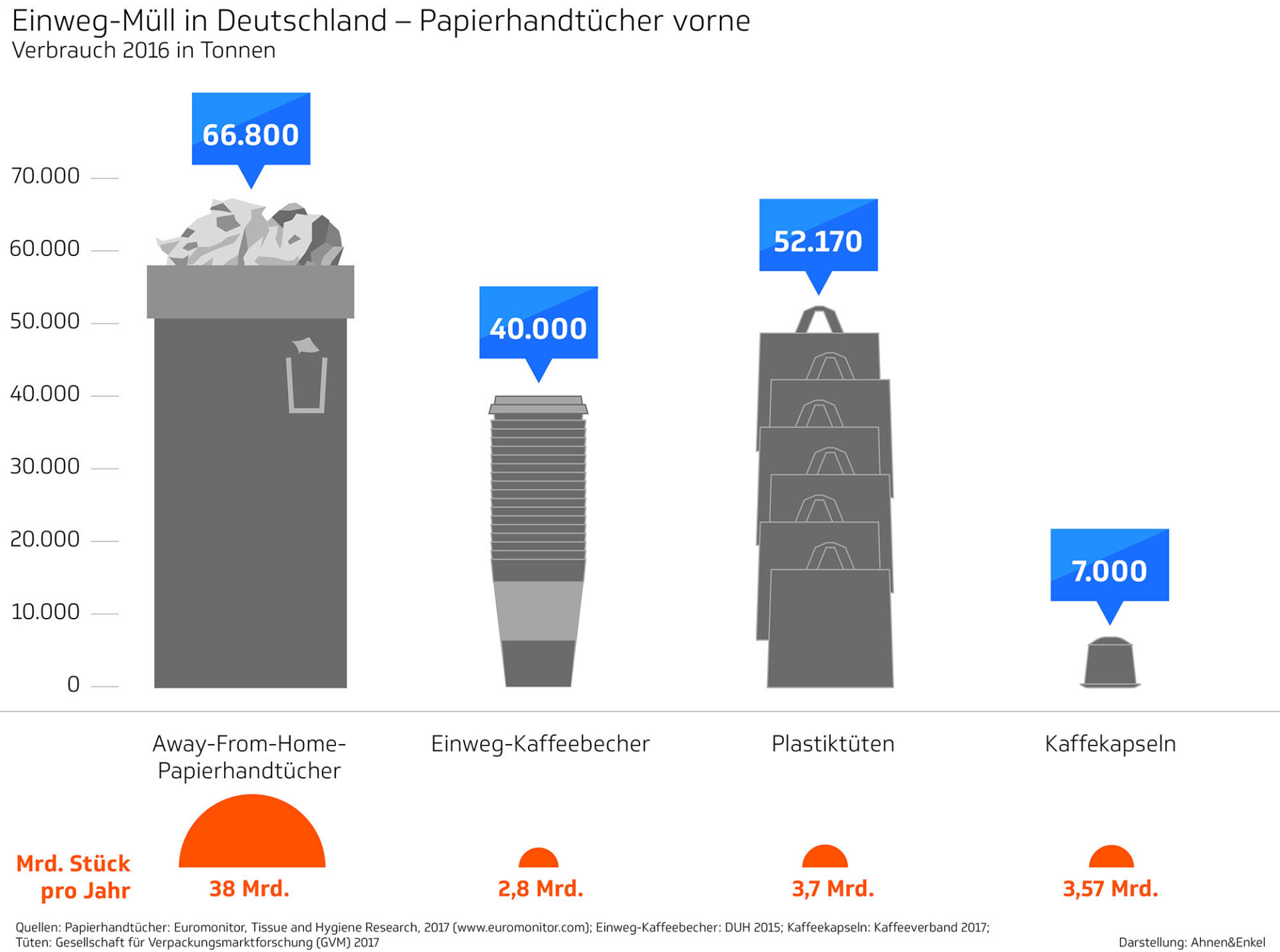 In Deutschland wurden 2016 Einweg-Papierhandtücher mit einem Gewicht von 66.800 Tonnen genutzt. Bei einem Gewicht von 1,5 bis 2 Gramm je Tuch seien das insgesamt 38 Milliarden Tücher. Die Branche gehe dabei von einer weiteren Absatzsteigerung von etwa einem Prozent jährlich bis zum Jahr 2021 aus. Zum Vergleich: Pro Jahr werden rund 2,8 Milliarden Coffee-to-go-Becher verkauft.