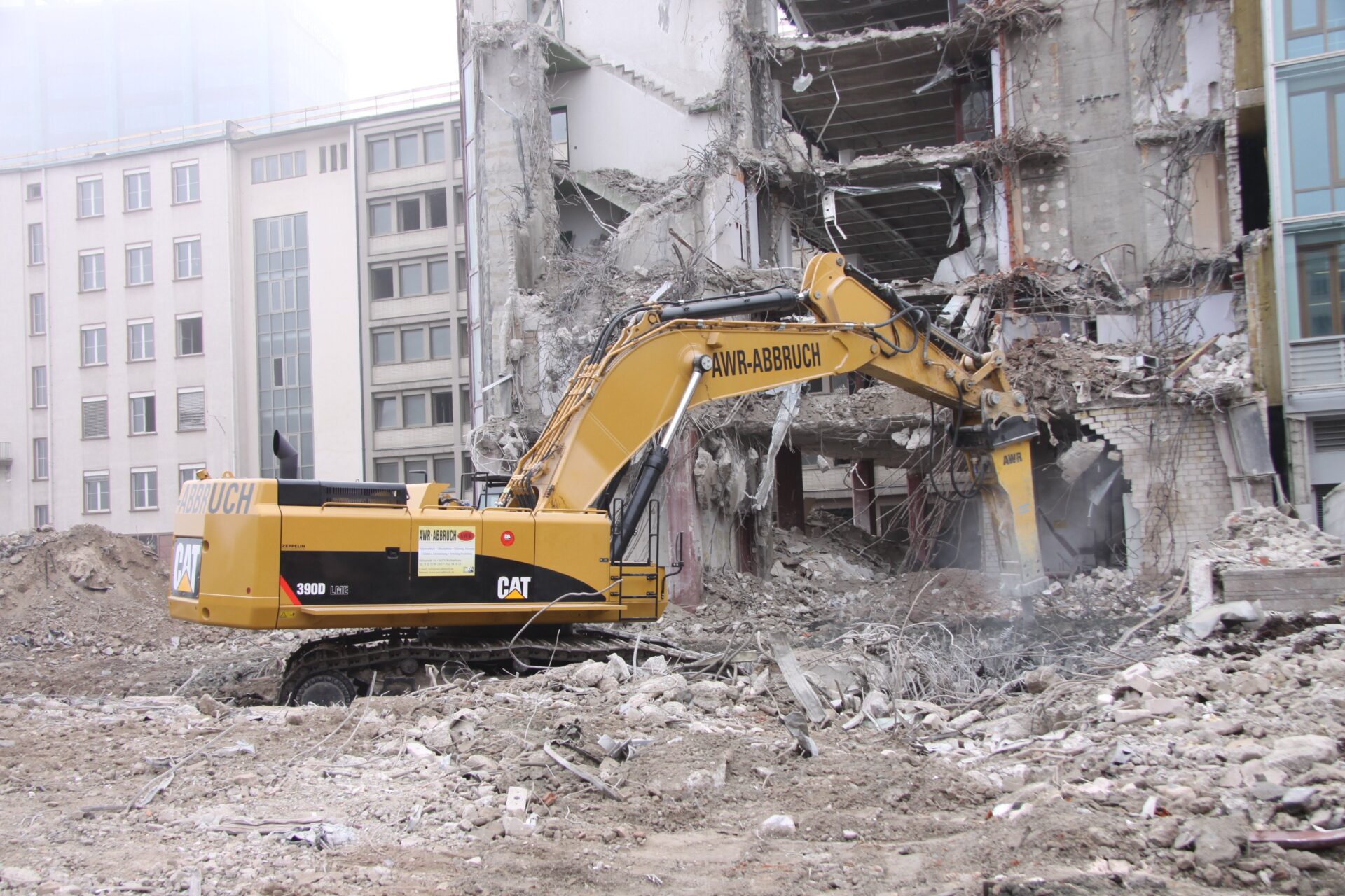 Volumenmäßig das größte Projekt, das momentan von AWR bearbeitet wird, ist der Rückbau eines ehemaligen Postverteilzentrums in der Frankfurter Hafenstraße mit 700 000 Kubikmeter umbautem Raum. Dort müssen gleich vier Neumaschinen anrücken, um das Pensum zu bewältigen. „Wir sind voll ausgelastet. Der deutsche Markt gibt genügend Aufträge her“, erklärt Geschäftsführer Ilmi Viqa. Daher wurde auch Verstärkung in Form der Cat-Kettenbagger geholt. „Unsere Kunden sind es gewohnt, dass wir immer mit einer großen Flotte arbeiten, um so auch Tempo machen zu können. Wir wollen unsere Kunden nicht nur in diesem Punkt zufriedenstellen, sondern auch Qualität liefern“, ergänzt er.