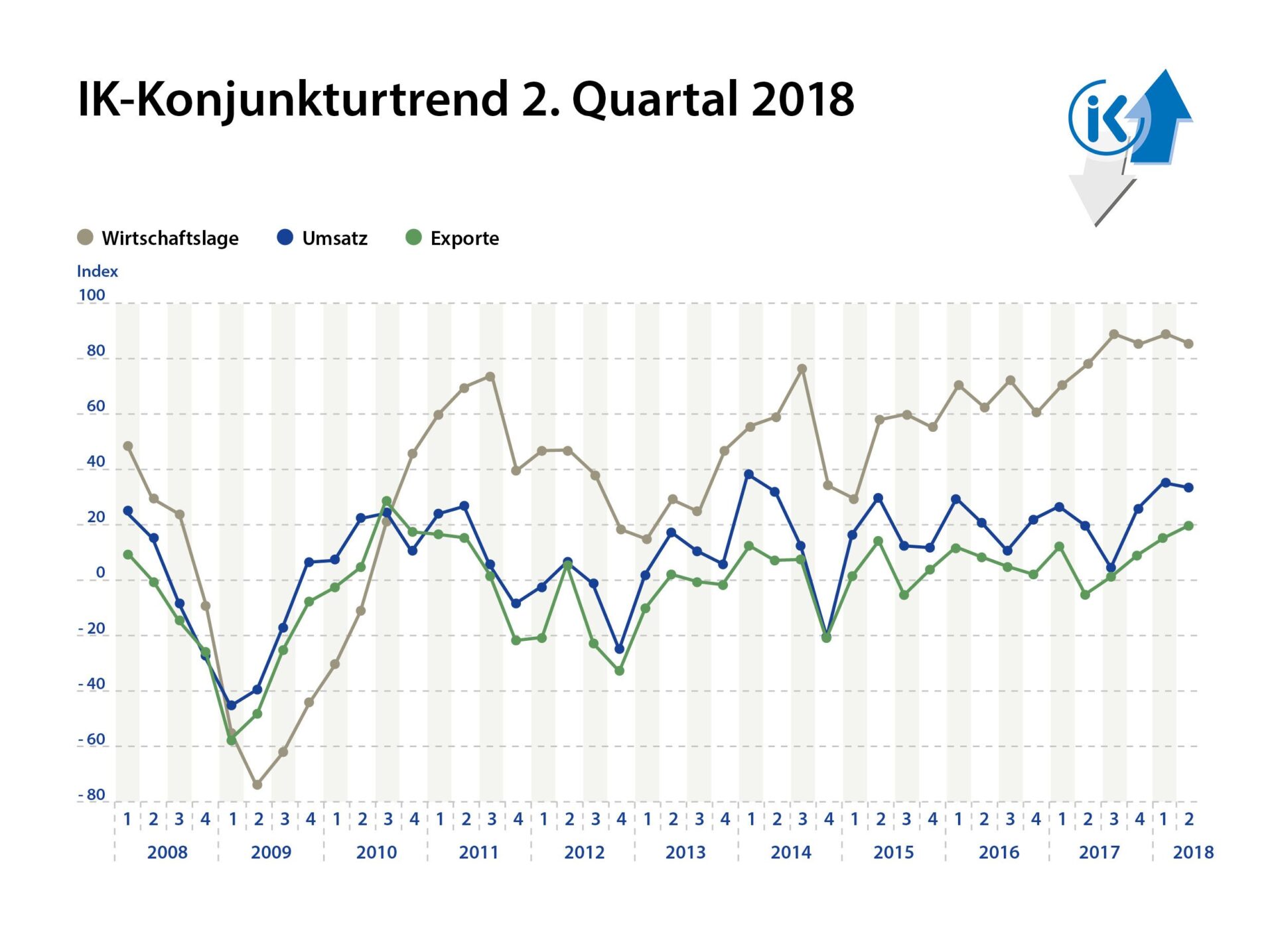 Trotz des schon hohen Niveaus im ersten Quartal sehen 40 Prozent der befragten Unternehmen weiter steigende Umsätze. Auch der Export kommt immer mehr in Schwung. Knapp ein Viertel der Unternehmen rechnet in den nächsten drei Monaten mit Umsatzzuwächsen. Insbesondere die guten Konjunkturentwicklungen in den EU-Staaten tragen dazu wesentlich bei. Nahezu 50 Prozent der Unternehmen prognostizieren für das zweite Quartal allerdings höhere Rohstoffpreise.