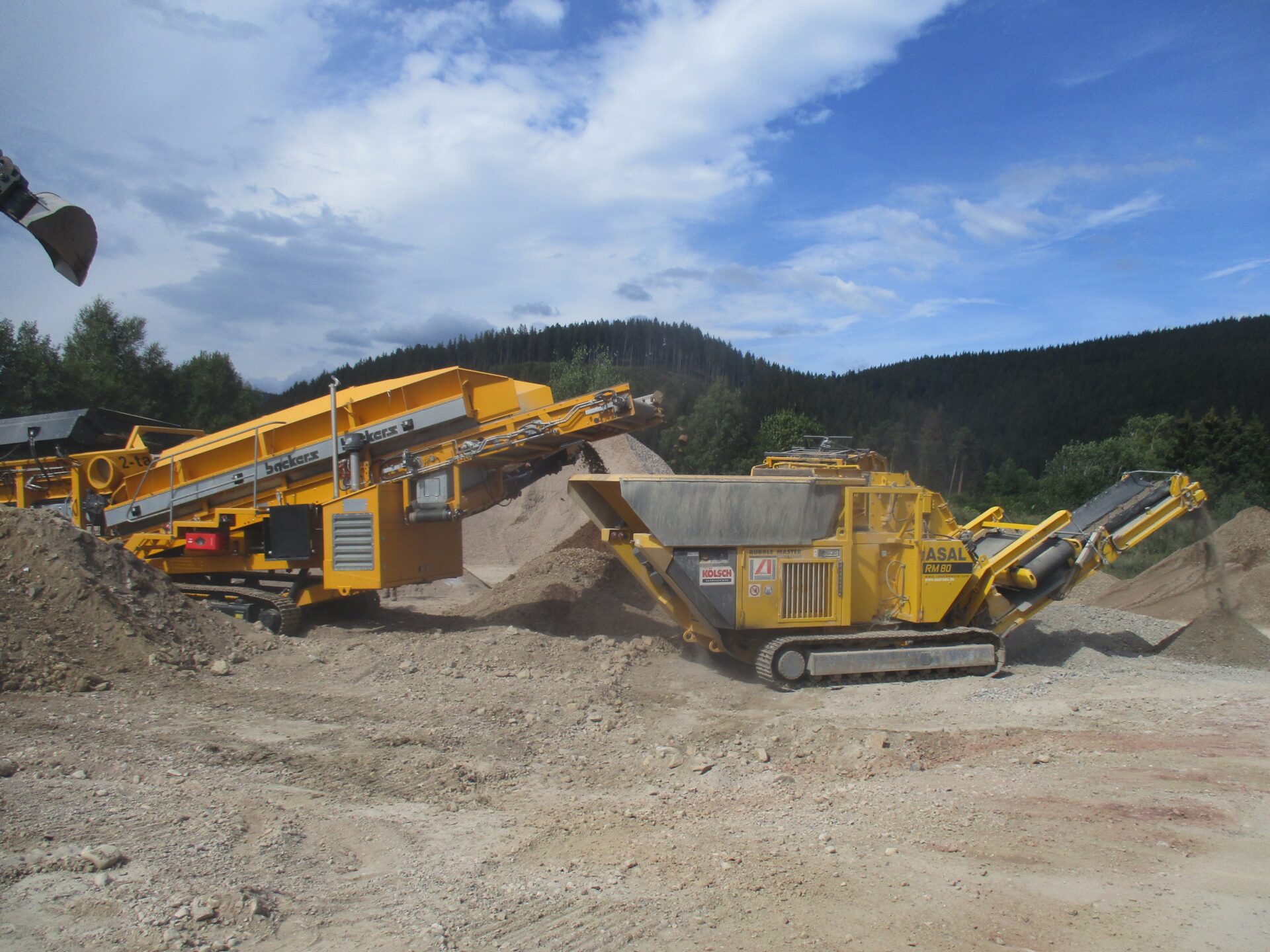 Das gereinigte Material (hier 40-150/300mm) könne direkt in einen (Prall-)Brecher übergeben werden. Dadurch, dass durch den Grizzlyscreen größere Teile vorab aussortiert wurden und durch die Sternsiebtechnik der Steinanteil nahezu sauber ist, sei ein relativ kleiner Brecher ausreichend, der entsprechend geringe Betriebskosten verursacht. Durch das gereinigte Material könne aber trotz kleineren Brechers eine hohe Leistung erzielt werden, weil viel effizienter gebrochen wird. Die Übergabe des Materials an den Brecher erfolge aufgrund der hohen Abwurfhöhe ohne weiteres Förderband. Zudem sei durch die Sternsiebtechnik eine dosierte Übergabe gewährleistest. Die gebrochenen Steine könnten als Frostschicht verwendet werden. Die Leistung liege bei 60-120 Tonnen Frostschicht pro Stunde (abhängig von Brecherleistung). Der Durchsatz könne bis zu 200 Tonnen pro Stunde betragen.