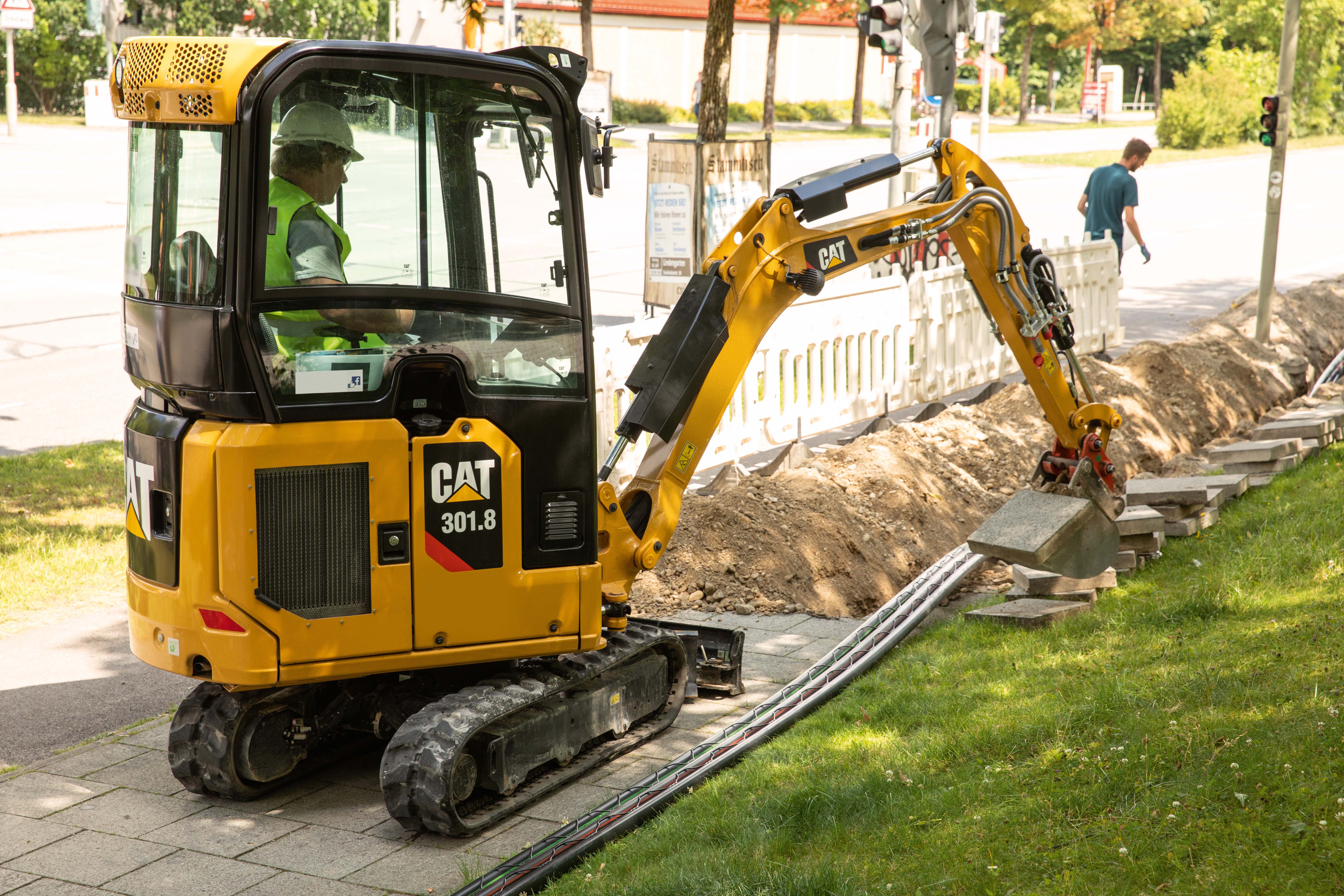 Meist mit kippbarer Kabine oder auch mit Schutzdach verfügbar – die neuen Cat Minibagger. Foto: Caterpillar/ZeppelinDie Einsatzgewichte der neuen Modelle reichten je nach Maschinenkonfiguration von rund 1,5 bis zwei Tonnen. Die typabhängige Grabtiefe betrage 2,34 oder 2,37 Meter und könne mit dem lieferbaren langen Stiel auf 2,54 oder 2,57 Meter vergrößert werden. Alle Typen seien mit Gummiketten und auf Wunsch mit Stahlketten erhältlich. In allen neuen Minibaggern arbeitet der Cat Dreizylinder-Dieselmotor C1.1 (EU-Stufe V) mit 16,1 kW beziehungsweise 21,6 PS, der durch hohe Leistungsdichte und konsistente Performance in einem breiten Drehzahlbereich überzeugt. Leerlauf- und Abstellautomatik verbessern die Kraftstoff-Effizienz.