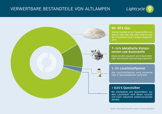 Recycling fange bei der richtigen Trennung des eigenen Abfalls an. Ausgediente LED- oder Energiesparlampen müssten separat entsorgt werden, damit die darin enthaltenen Rohstoffe recycelt werden können. Rund 3.000 Wertstoffhöfe und über 4.500 Händler würden Verbrauchern bei der richtigen Entsorgung helfen und ausgediente Leuchtmittel zurücknehmen. Für größere Mengen im gewerblichen Einsatz stünden über 350 Großmengensammelstellen dem E-Handwerk und Großverbrauchern für die Rückgabe zur Verfügung. „Dank des aktiven Engagements der Hersteller und Händler im Lightcycle-Rücknahmesystem konnten so in den letzten Jahren über 60.000 Tonnen Altlampen recycelt werden“, lobt Stephan Riemann, Geschäftsführer Lightcycle. Ihre nächste Sammelstelle finden Verbraucher unter sammelstellensuche.de.