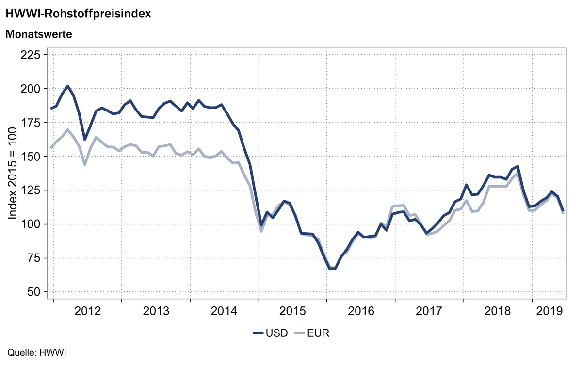 Der HWWI-Rohstoffpreisindex fiel im Juni im Durchschnitt um 9,1 Prozent (in Euro: -10,0 Prozent) gegenüber dem Vormonat. Damit erreicht der Gesamtindex einen Punktestand von 109,5 Punkten (in Euro: 107,6 Punkten). Während im Mai die Preise aller im Index vertretenen Rohstoffgruppen sanken, fielen im Juni allen voran vor allem die Preise der fossilen Energierohstoffe. Der Index für Energierohstoffe sank um 10,9 Prozent (in Euro: -11,7 Prozent), wobei sich Rohöl im Monatsdurchschnitt um 10,6 Prozent (in Euro: -11,4 Prozent) verbilligte. Der Anstieg bei den Industrierohstoffen lag bei 1,8 Prozent (in Euro: +0,9 Prozent), wobei der Index der NE-Metalle um 1,6 Prozent (in Euro: -2,5 Prozent) sank. Die Preisbildung auf den Rohstoffmärkten erfolgte im Juni weiterhin unter großer Unsicherheit. Das für den 25. Juni 2019 geplante Treffen der OPEC+ wurde kurzfristig auf Anfang Juli verschoben, um die Ergebnisse des G20-Treffens in Osaka abzuwarten. Erneut verschärfte sich der Konflikt der USA mit dem Iran. Darüber hinaus belastete der Handelskonflikt zwischen China und den USA weiterhin die Preisbildung auf den Rohstoffmärkten. Der Index ohne Energie stieg im Juni um 3,5 Prozent (in Euro: +2,5 Prozent) gegenüber dem Vormonat und notiert bei 112,5 Punkten (in Euro: 110,6 Punkten).