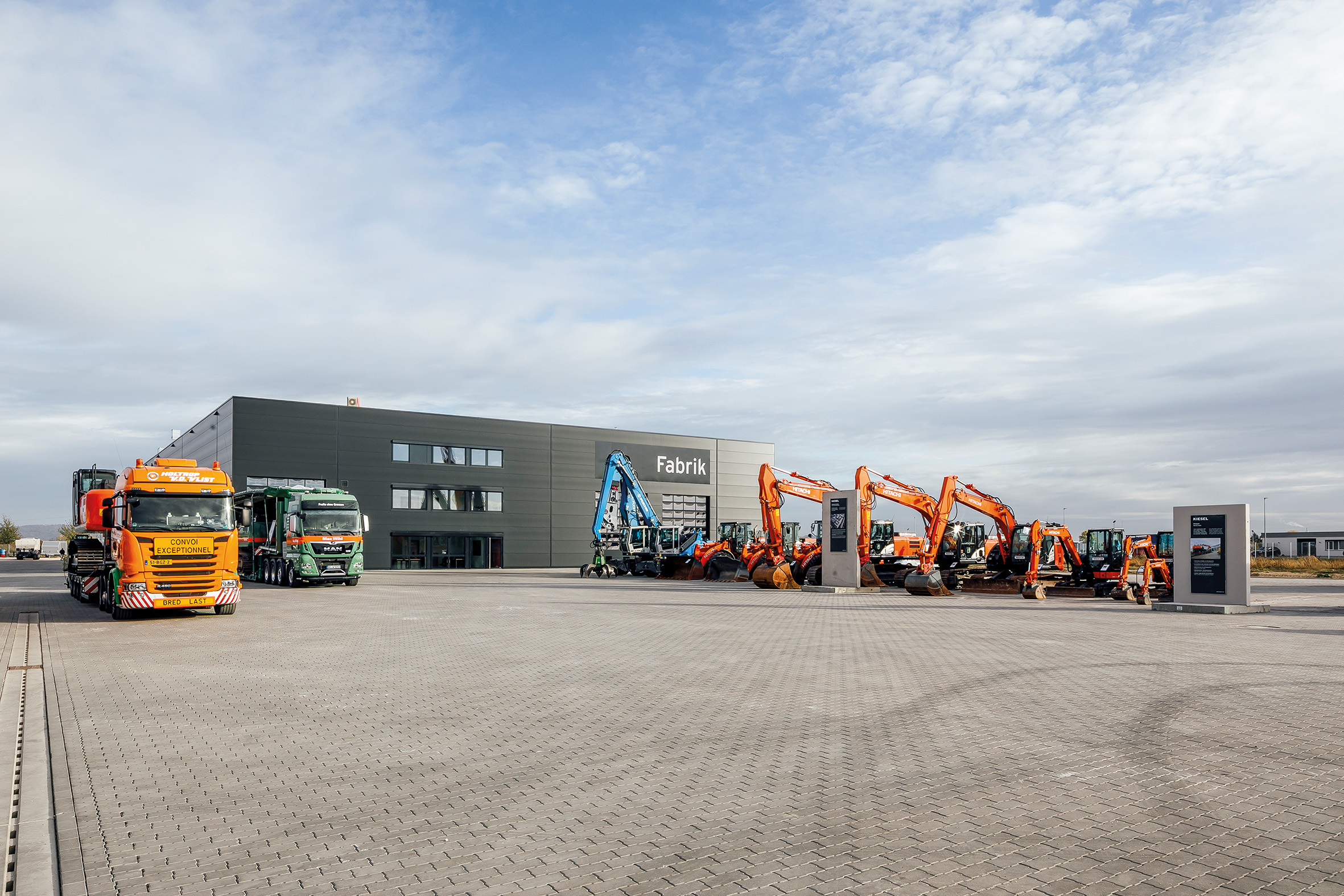 Auf 3.800 qm werden Radlader, Mobil- und Kettenbagger aber auch Dumper entsprechend der individuellen Kundenwünsche aus- und umgerüstet. „Die Maschinen kommen immer ‚nackt‘ hier an“, erläutert Thomas Marquard, technischer Leiter der Kiesel-Fabrik. Das bedeutet, Maschinen, die in der Stockstadter Werkstatt ankommen, sind so, wie sie ab Werk vom Fließband kommen: in der herstellertypischen Lackierung, mit Serien-Ausstattung, ohne Schnellwechselsystem und ohne Anbaugerät.