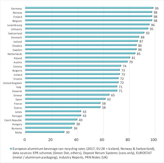 Die europaweite Recyclingquote stieg von 72,8 % im Jahr 2016 auf 74,5 % im Jahr 2017 – das entspricht einem Zuwachs von 2,3 % und einem neuen Allzeithoch. In Deutschland liegt die Recyclingquote von Getränkedosen aus Aluminium bereits bei 99%. Damit ist Deutschland sowohl in Europa als auch weltweit führend im Recycling von Getränkedosen.