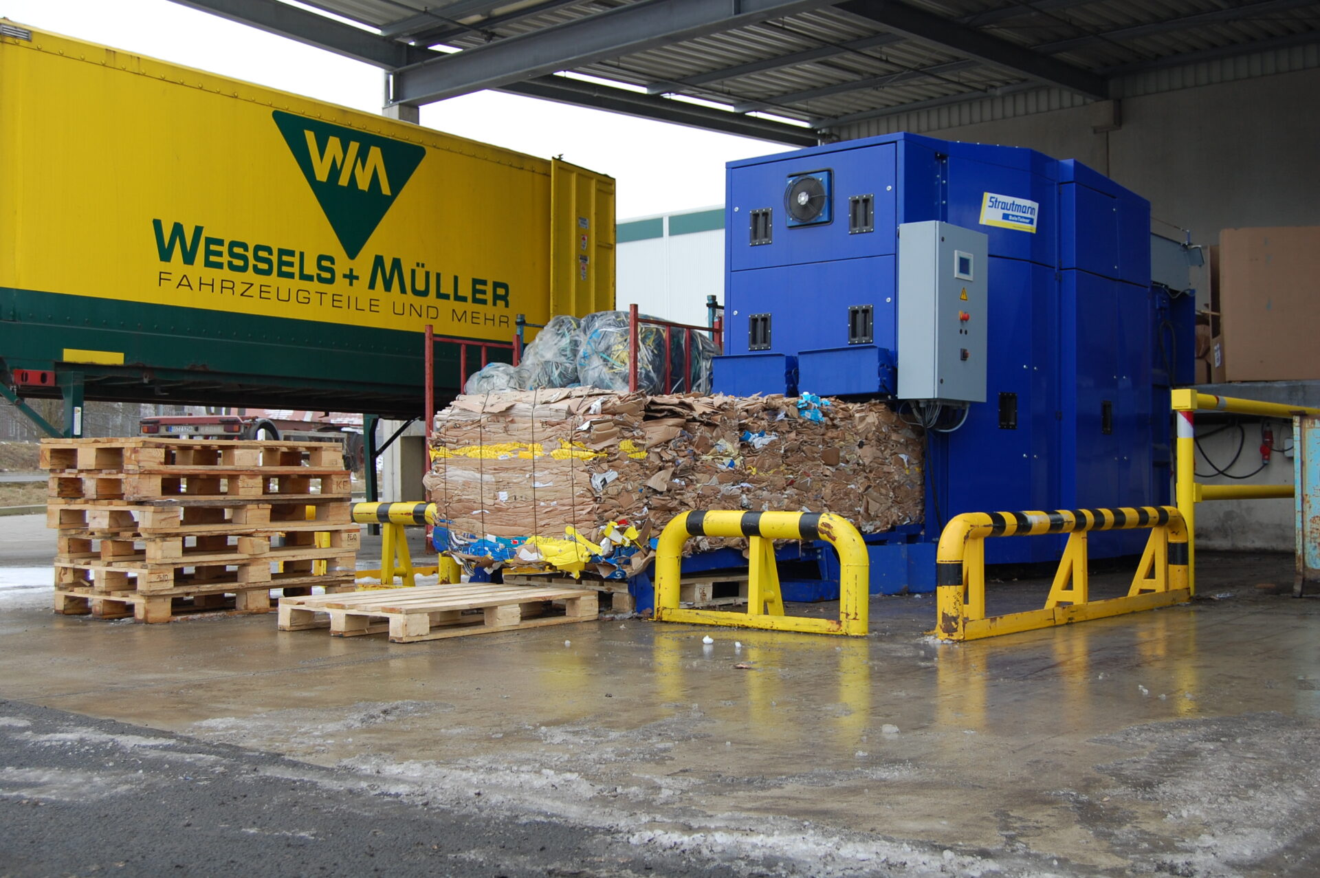 LKW brachten das leicht komprimierte Material zum Entsorger, wo es weiter verdichtet wurde. Erst im Anschluss ging es zum Papierwerk. Ein kostenträchtiger Umweg. Der BaleTainer von Strautmann reduziert die Kartonagen gleich im Zentrallager um bis zu 90 Prozent.