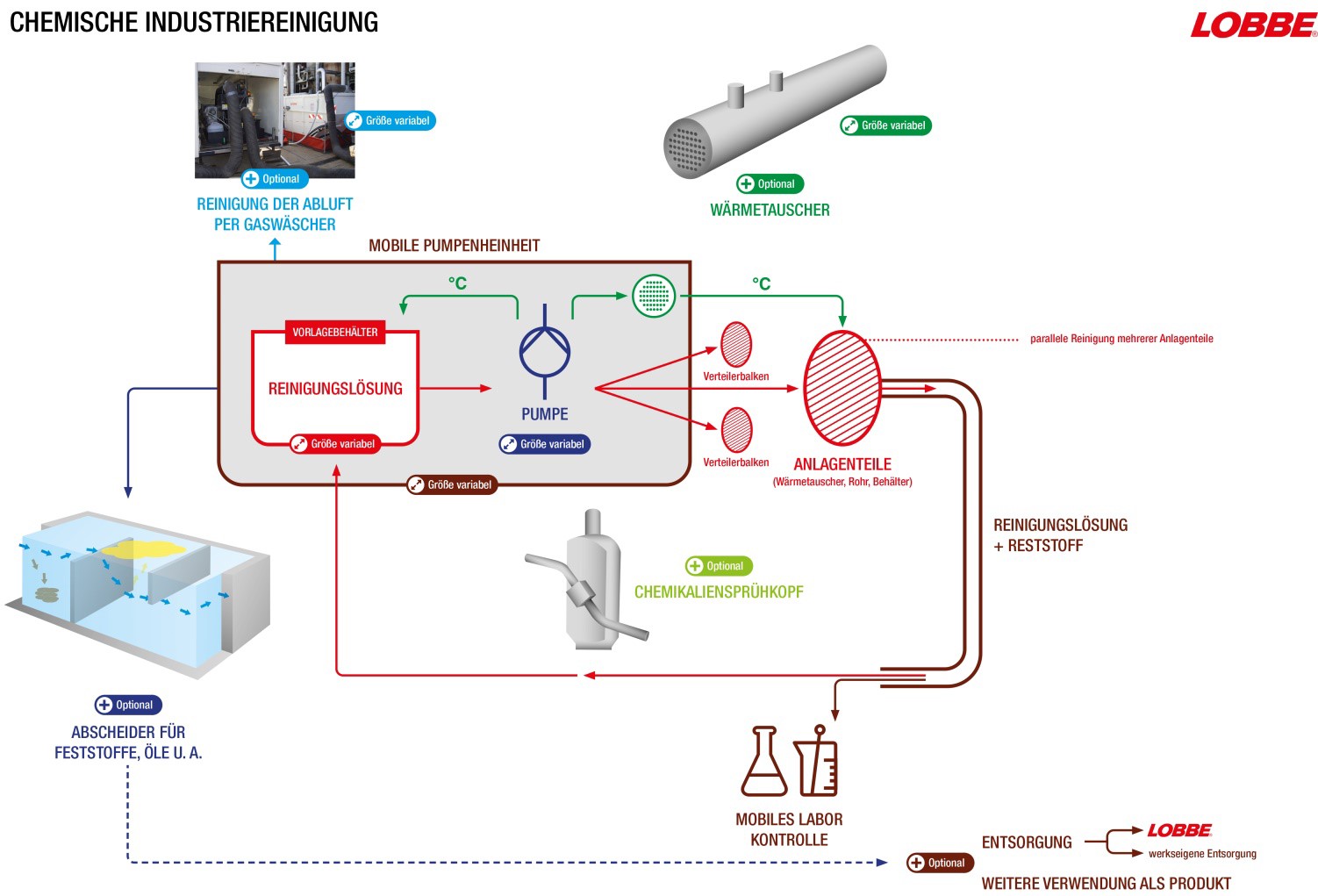 Die Parameter, wann der Wirkungsgrad unter die Wirtschaftlichkeitsgrenzen fällt, sind von TOTAL eindeutig definiert. So war im Februar 2020 ein Intervention fällig: Die Kesselschlange eines der Wärmetauscher (fachlich: „Abhitzewärmetauscher“) musste chemisch gereinigt werden. Die angewendeten Verfahren bei der chemischen Industriereinigung sind hochspezifisch. Bei TOTAL war die Konfiguration werksseitig bis ins letzte Detail vorgeschrieben: externe Pumpstation mit geschlossenem Mischbehälter und Hochleistungs-Gaswäscher. Dieser wäscht den Schwefelwasserstoff aus der Atmosphäre, der beim Lösen der Rückstände aus Kohlenstoff- und Schwefelverbindungen entsteht. Der Mischbehälter war überdies als Abscheider ausgelegt. So konnten die gelösten Feststoffe aus dem Reinigungskreislauf entfernt werden. Das gesamte Equipment musste aus Sicherheitsgründen in einer mobilen Auffangwanne stehen. Lobbe bietet diese Dienstleistung seit vielen Jahren an. Durch die Technik, die Erfahrung und das Know-how ist Lobbe im Sektor der chemischen Industriereinigung führend und deckt diese Marktnische sehr erfolgreich ab.