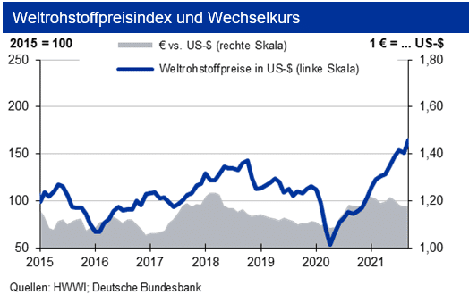 Da sich der Wechselkurs des Euro zum US-Dollar im Monatsdurchschnitt kaum verändert zeigte, bewegt sich der Anstieg in Inlandswährung in gleicher Größenordnung. Unverändert ist bei etlichen Rohstoffen die Versorgungssituation eng und zudem von Transportproblemen belastet. Nach einer ersten Entspannung bei Rohöl hat sich der Markt wieder gedreht. Die von der OPEC Anfang September 2021 angekündigte