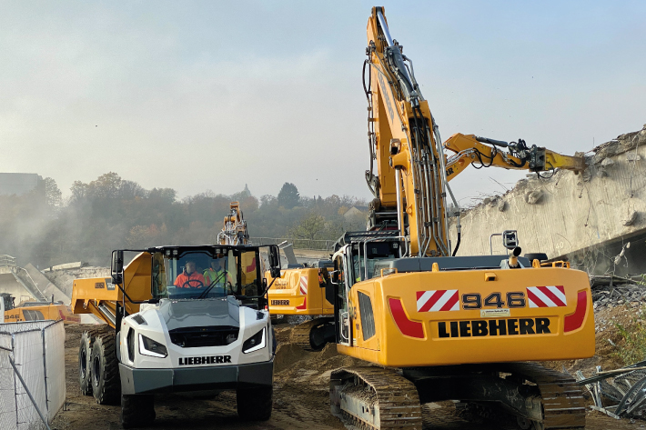 Mit 23 Liebherr-Baumaschinen werden in sechs Wochen rund 15.000 m³ Abbruchmaterial einer ehemaligen Großbrücke in Wiesbaden abtransportiert. Bild: Liebherr