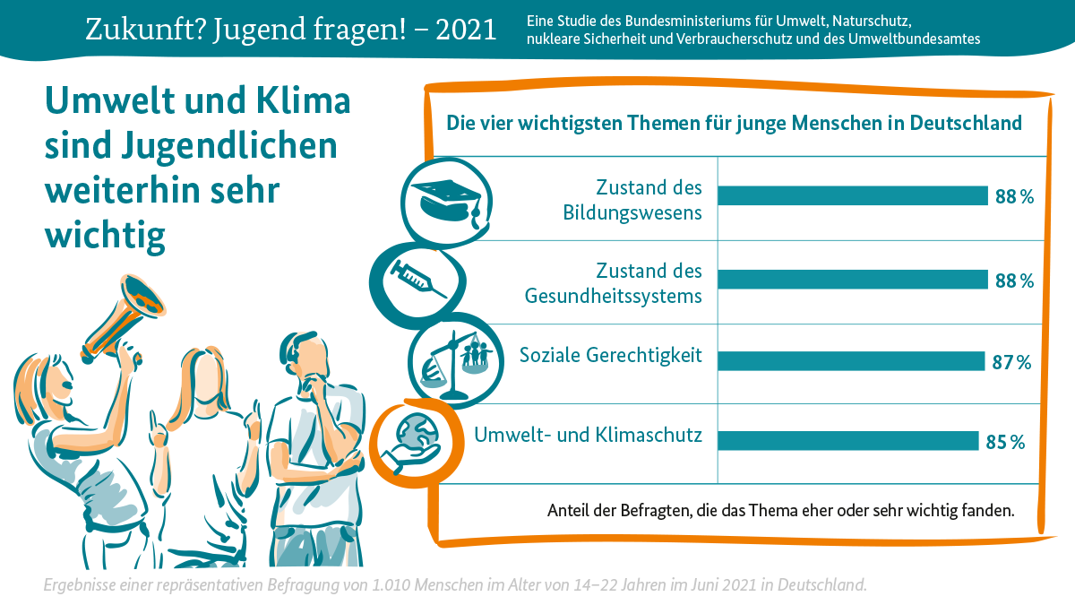 85 Prozent der befragten Jugendlichen finden Umwelt- und Klimaschutz wichtig. Damit zählt das Thema neben dem Zustand des Bildungswesens (88 Prozent), dem Zustand des Gesundheitssystems (88 Prozent) und sozialer Gerechtigkeit (87 Prozent) zu den vier wichtigsten Themen für junge Menschen in Deutschland. Zum eigenen Verhalten ergab die Studie: 62 Prozent der Jugendlichen nutzen häufig das Rad oder öffentliche Verkehrsmittel für alltägliche Wege, 49 Prozent verzichten oft auf Plastikverpackungen, 23 Prozent unterstützen häufig Online-Petitionen für umweltpolitische Anliegen und 40 Prozent haben bereits an Klimastreiks teilgenommen. Dabei finden die befragten jungen Menschen mit deutlicher Mehrheit, dass nicht nur jede und jeder Einzelne, sondern auch die Bundesregierung sowie Industrie und Wirtschaft mehr für den Umwelt- und Klimaschutz tun sollten.