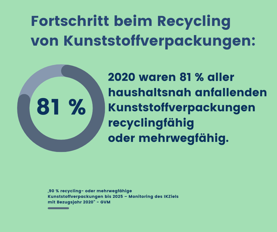 Bereits im Jahr 2018 haben sich die in der IK organisierten Hersteller von Kunststoffverpackungen ambitionierte Ziele gesetzt: Bis 2025 sollen Haushaltverpackungen aus Kunststoff auf dem deutschen Markt zu 90 Prozent recycling- und mehrwegfähig sein. Haushaltsverpackungen umfassen dabei sowohl die beteiligungspflichtigen Verpackungen im Gelben Sack als auch die PET-Getränkeflaschen im Pfandsystem, deren Recyclingfähigkeit 2020 bei nahezu 100 Prozent lag.