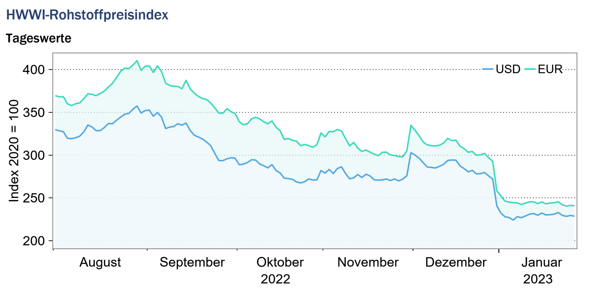 Der Index der Preise für Industrierohstoffe hat sich im Januar nicht wesentlich verändert. Der Index für Industrierohstoffe lag im Januar 3,5 % über dem Vormonat und 19,7 % unter dem Vorjahreswert vom Januar 2022. Die seit einigen Monaten relativ entspannte Lage setzte sich auch zu Jahresbeginn fort. Die einzelnen Subindizes entwickelten sich jedoch unterschiedlich. Der Teilindex für Agrarrohstoffe fiel (-1,8 %), während der Subindex für Nichteisenmetalle stieg (+4,7 %). Hervorzuheben ist in diesem Segment der Zinnpreis, der wie im Vormonat erneut zweistellig zulegte (+16,6 %). Der Zinnmarkt zeigte im Jahresverlauf 2022 eine hohe Volatilität, die stabile Nachfrage der letzten Monate führte jedoch seit Oktober zu einem Preisanstieg.