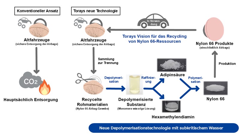 Nylon 66 ist aufgrund seiner hohen Wärmebeständigkeit und mechanischen Festigkeit ein unverzichtbares Material in der Automobil- und Industrieproduktion. Weltweit liegt der jährliche Bedarf bei rund 1,3 Millionen Tonnen, davon entfallen etwa 100.000 Tonnen auf Japan. Einsatzgebiete sind unter anderem Airbags, Reifencordstoffe sowie technische Kunststoffbauteile wie Kühlerbehälter oder Zylinderkopfhauben. Infolge verschärfter gesetzlicher Vorgaben zur Kunststoffverwertung, insbesondere im Automobilsektor, gewinnt das Recycling von Nylon 66 zunehmend an Bedeutung. So müssen in Japan beispielsweise ausgediente Airbags aus Nylon 66 inzwischen verpflichtend gesammelt werden – ein wichtiger Ansatzpunkt für das chemische Recycling.