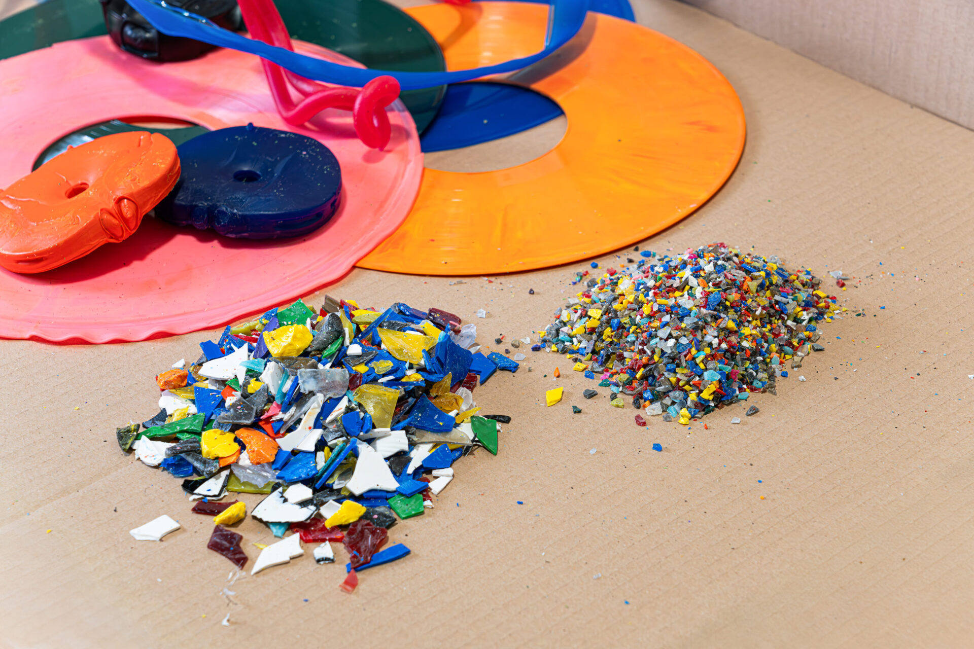 Das Endprodukt sind hochwertige PVC-Flakes, die wieder im Produktionsprozess der Schallplattenpressung nutzbar sind. Durch die bunte Mischung der Flakes entsteht so eine individuelle marmorierte Färbung beim Pressen. Record Industry ist stolz darauf, dass sie durch diese farbenfrohen Schallplatten nun auch ein hundertprozentiges Recyclingprodukt im Programm haben.