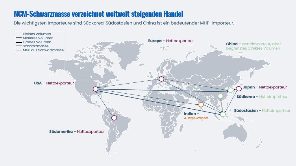 Weltweiter Handel und Massenstrome von Schwarzmasse, NCM aus Kathodenmaterial: Nickel, Cobalt, Mangan, MHP: Zwischenprodukt zur Produktion Batterien. Copyright: Gaus, R., EIT Raw Materials, 2025, unveröffentlicht.