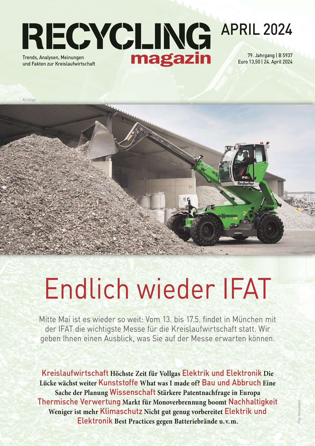 Das RECYCLING magazin berichtet seit 80 Jahren unabhängig und aktuell über die wirtschaftlichen, politischen und technischen Entwicklungen in der Recycling- und Entsorgungswirtschaft. Ihr Maßstab ist ein qualitativ hochwertiger Journalismus mit allen Facetten einer modernen Berichterstattung. mehr