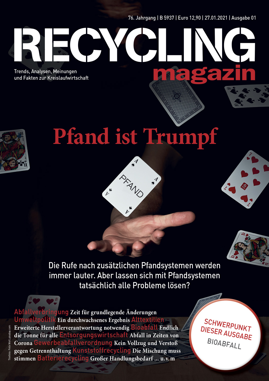 Das RECYCLING magazin berichtet seit über 75 Jahren unabhängig und aktuell über die wirtschaftlichen, politischen und technischen Entwicklungen in der Recycling- und Entsorgungswirtschaft. Ihr Maßstab ist ein qualitativ hochwertiger Journalismus mit allen Facetten einer modernen Berichterstattung. mehr