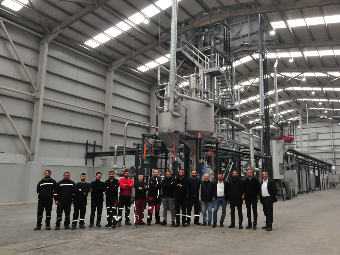 Die Mitarbeiter und Geschäftsführung von PAAG vor der recoSTAR PET 165 HC iV+ PET-Bottle-to-Bottle-Recyclinganlage von Starlinger im Recyclingwerk in Gebze, Türkei. Copyright: PAAG