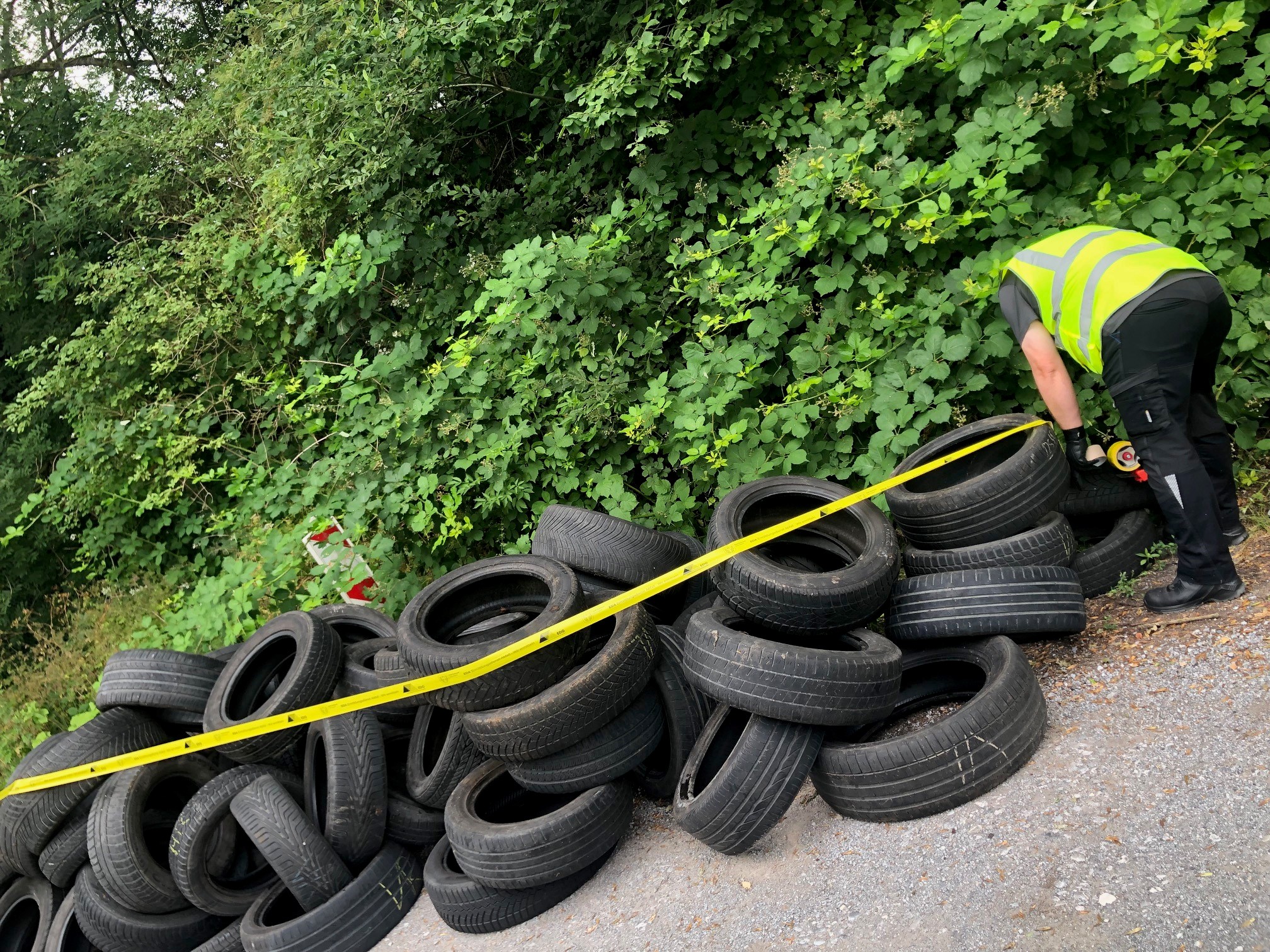 EDA-Mitarbeiter kennzeichnet die illegale Abfallablagerung von Autoreifen. Copyright: EDG Entsorgung Dortmund GmbH