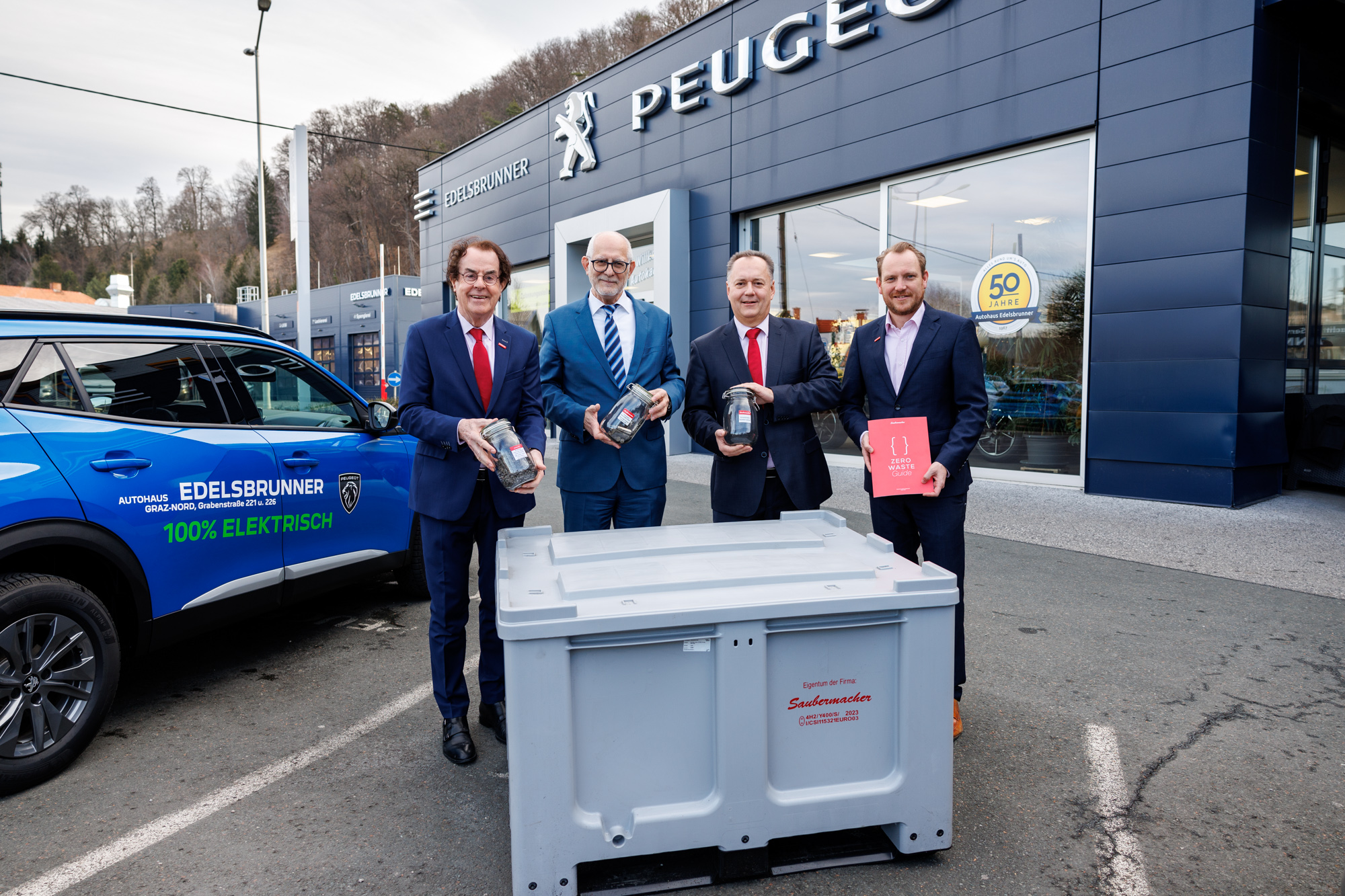 Foto (v.l.n.r.). Hans Roth, Saubermacher Gründer; Klaus Edelsbrunner, Bundesgremialobmann WKO; Gerhard Hecker, Geschäftsleiter Saubermacher Österreich; Thomas Haid, Geschäftsführer Saubermacher Battery Services. Copyright: Saubermacher