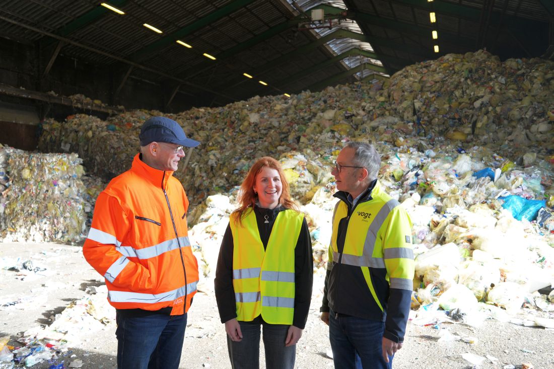 Geschäftsführer Andreas Vogt, Vogt Plastic (rechts), führt bvse-Kunststoffexpertin Anna Roeb (mitte) und bvse-Vizepräsident Herbert Snell (links) durch das Werk in Rheinfelden. Copyright: bvse
