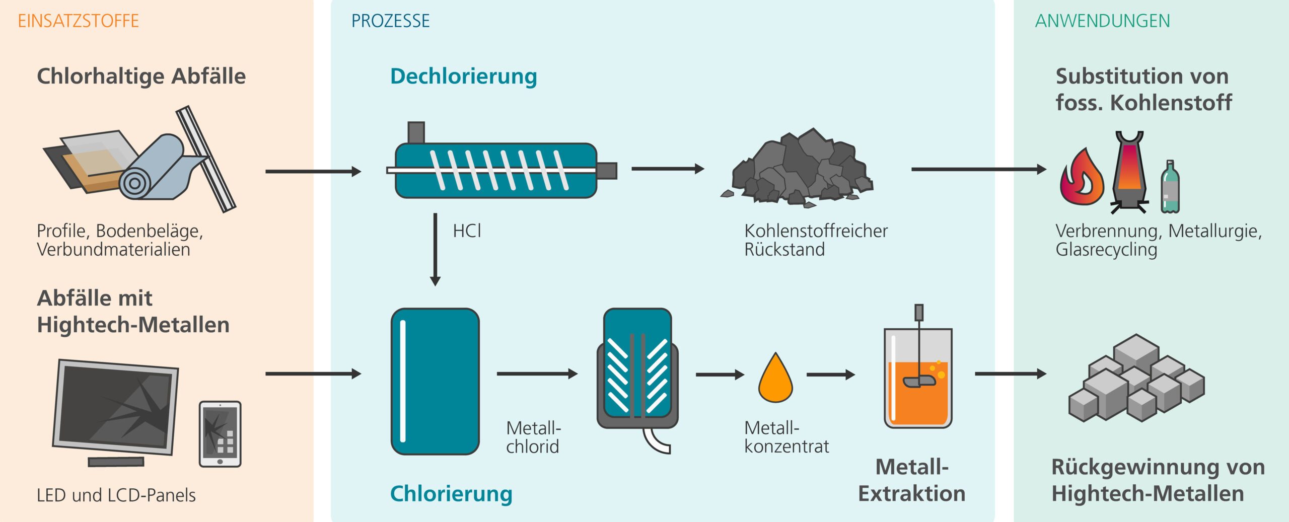 Prozessschema der „Chlor-Plattform“ zur Rückgewinnung kritischer Metalle und rohstoffliche Verwertung chlorhaltiger Abfälle. Bild: Fraunhofer Umsicht