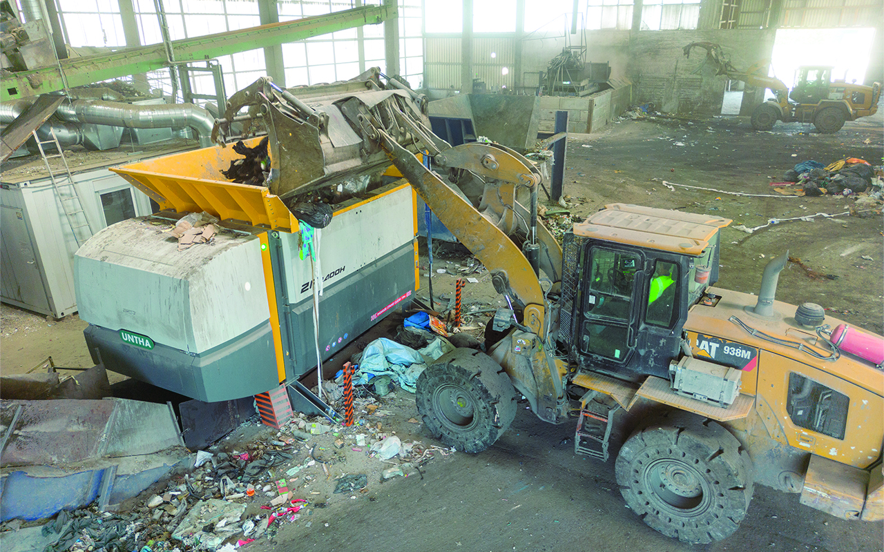 Der Zerkleinerer kann durch die geringe Aufgabehöhe einfach mit einem Radlader beschickt werden. (Quelle: Untha Shredding Technology)