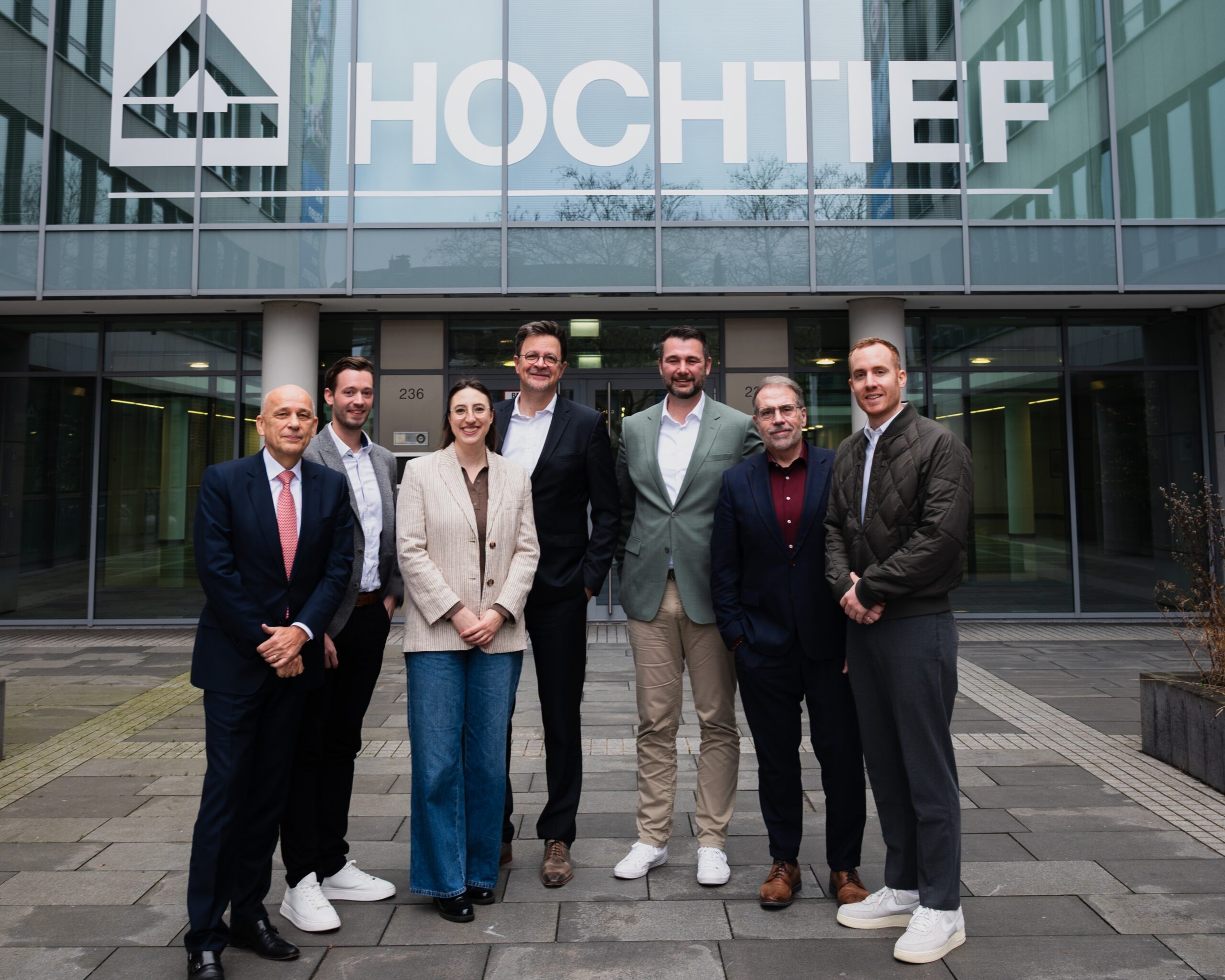 Auftakt der Zusammenarbeit am EDGITAL-Standort in Essen (von links nach rechts): Pierre Vincent (Geschäftsführer, EGN), Rouven Weber (Manager Strategie & Nachhaltigkeit, EGN), Franziska Müller (Geschäftsführerin, EDGITAL), Bernd Holtwick (CFO und COO, HOCHTIEF PPP Solutions), Tim Homann (Leiter Digitalisierung und digitale Transformation, EGN), Stefan Visser (Geschäftsführer, EGN), Dr. Maximilian Brand (Geschäftsführer, EDGITAL). Copyright: Hochtief