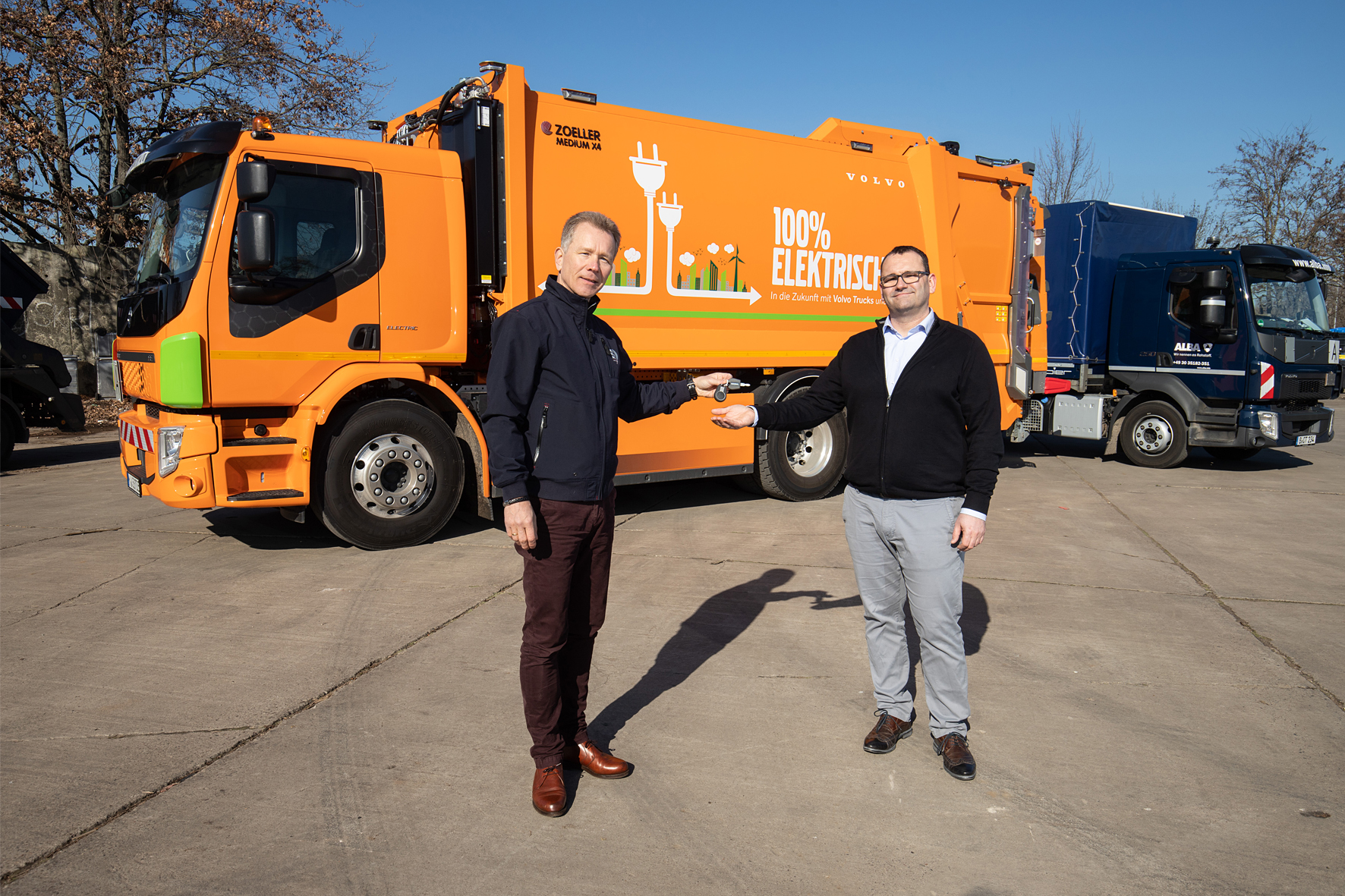 Uwe Hellmich, Key Account Manager Kommunal Volvo Trucks (links), überreichte den Fahrzeugschlüssel für den Volvo FE Electric an Christian Bobrowski, Prokurist der Alba Logistik GmbH. Bild: Alba/Amin Akthar