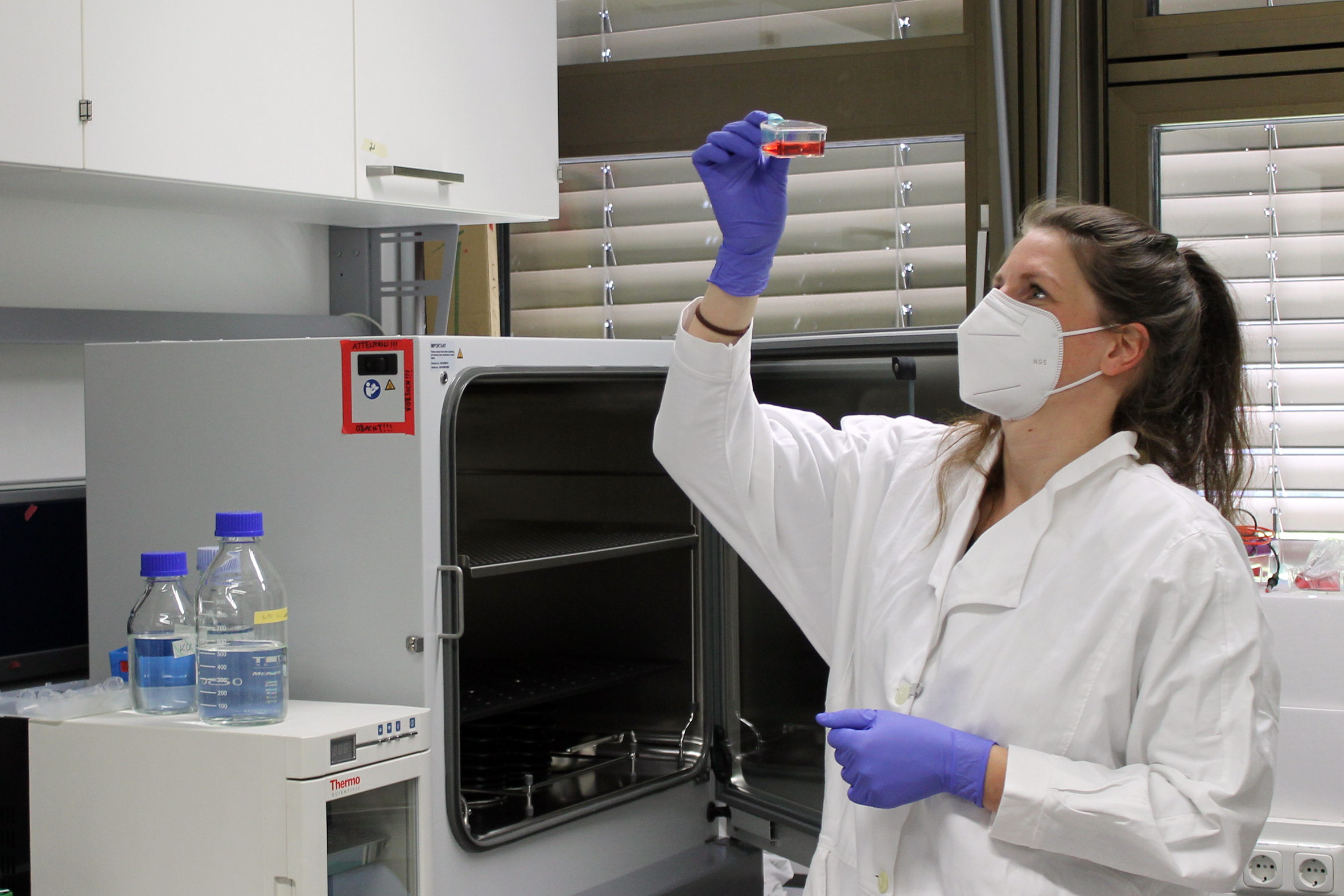 Projektmitarbeiterin Anja Ramsperger bei einem Zellkulturexperiment zu den potenziellen Auswirkungen von Plastikpartikeln auf den Menschen. (Quelle: Christian Wißler)