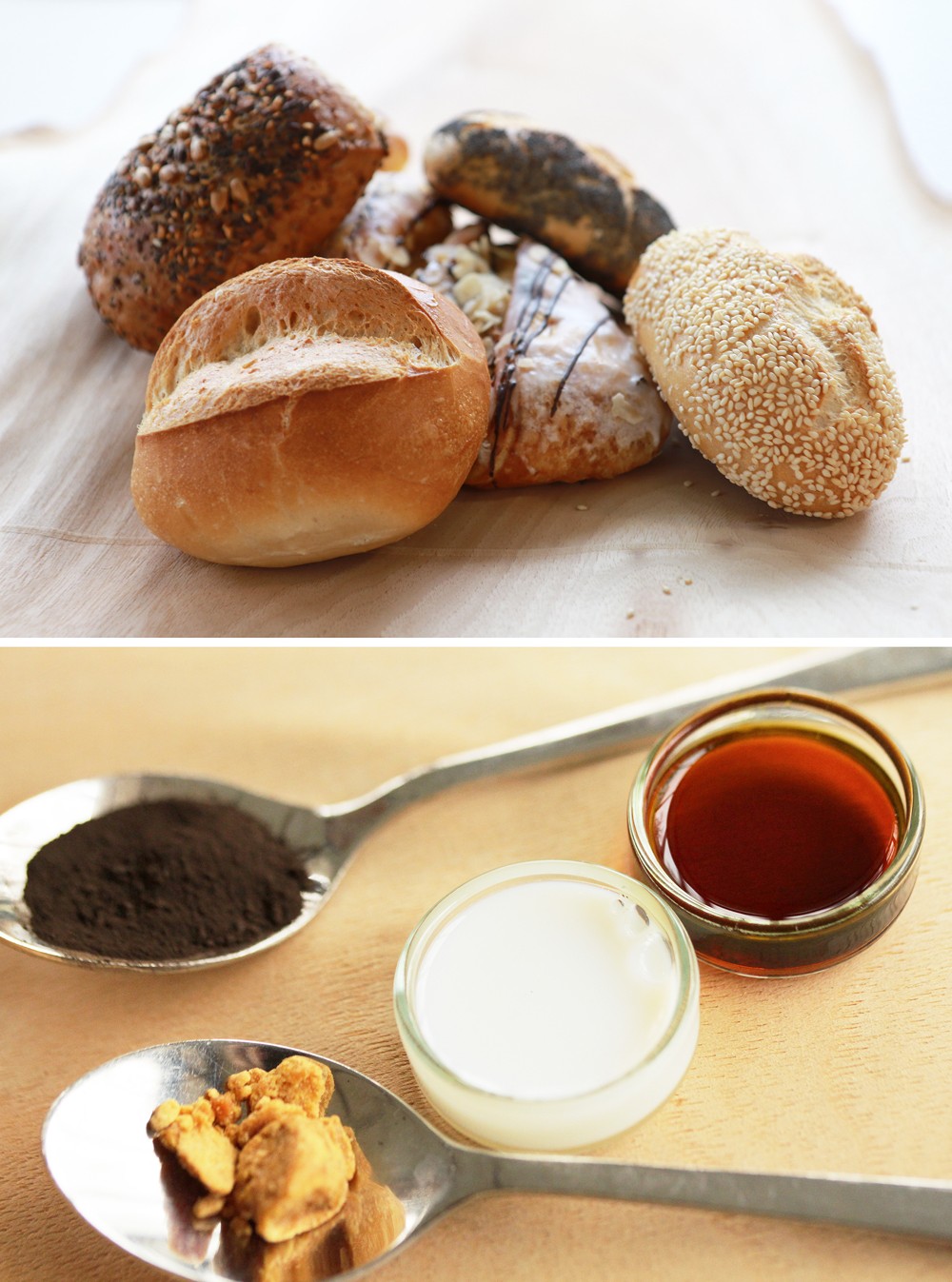 Aus Altbackwaren (Bild oben) wird die Basischemikalie HMF gewonnen. Bild unten: HMF als braune wässrige Lösung und als bräunlicher Feststoff und Kohle (hier pulverförmig). HMF lässt sich unter anderem zu Polyesterharzen weiterverarbeiten. Diese können zur Herstellung von wässrigen Polyurethandispersionen genutzt werden (weiße Flüssigkeit). Bild: Fraunhofer WKI/Manuela Lingnau
