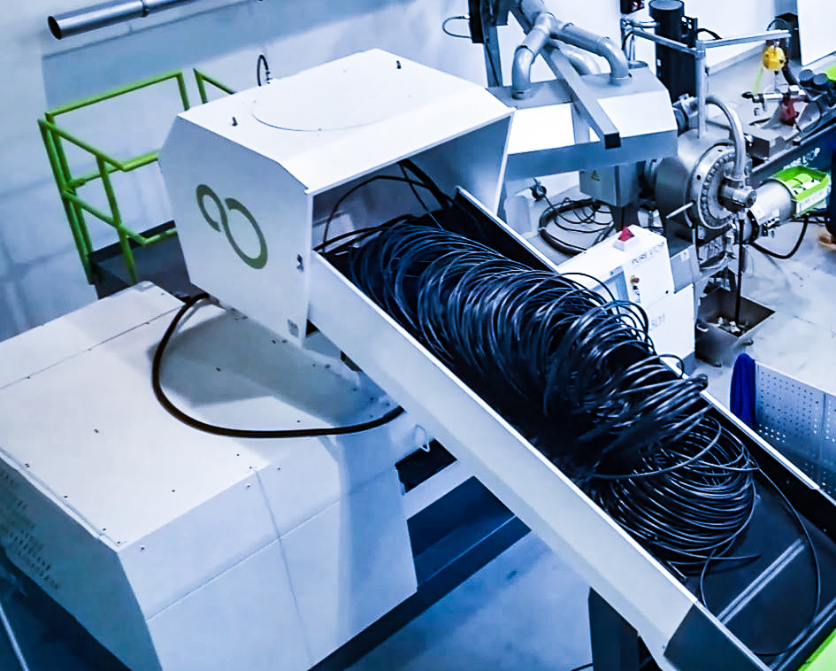 Als Material-Allrounder verarbeitet die ISEC evo Maschine sperrige Schlauchbündel ebenso wie Anfahrklumpen und Mahlgut oder komplette Rollen mit Tropfbändern. Foto: Pure Loop