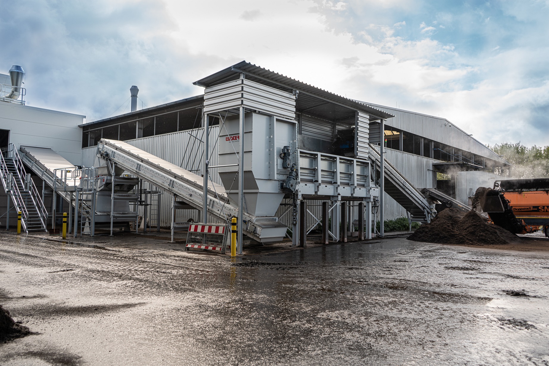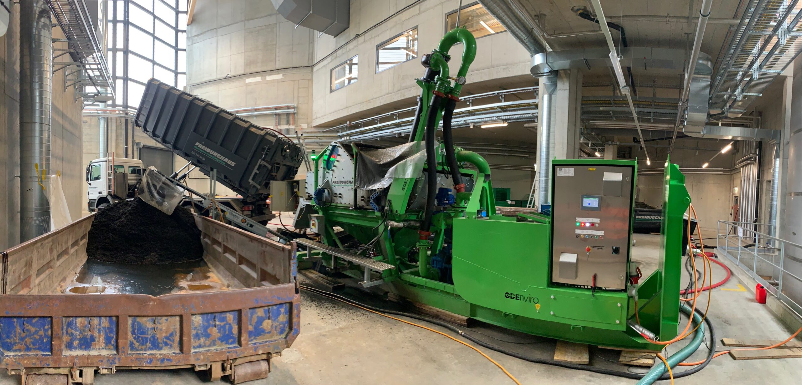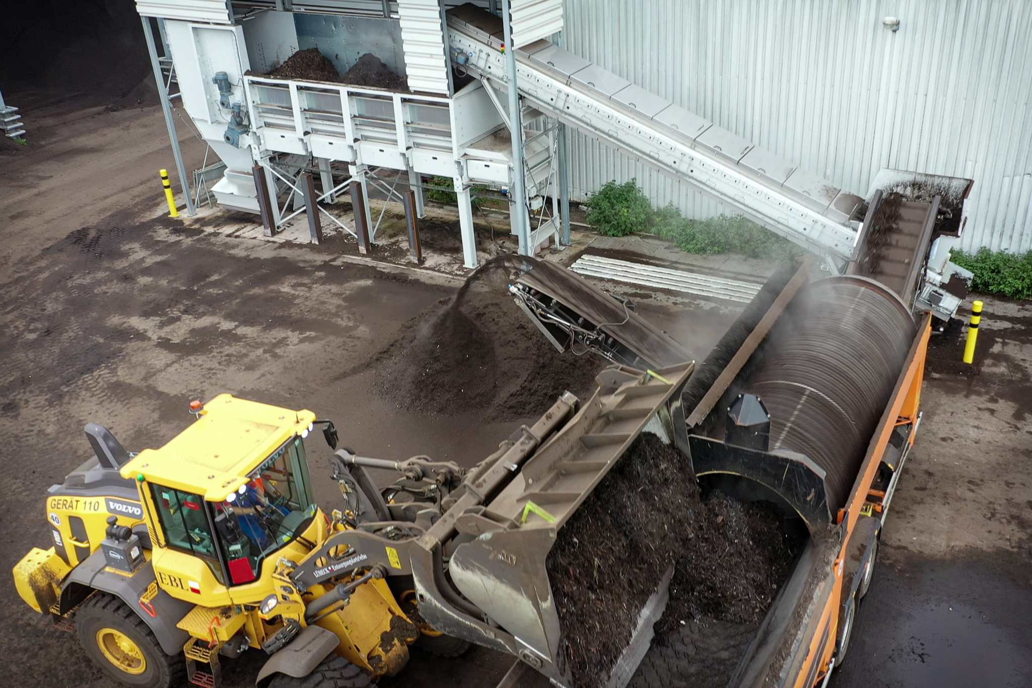 Aufgabe des Bioabfalls mittels Radlader, Reinigung über Siebtrommel, Weiterleitung belasteter Bioabfall Richtung AirLift. Bild: Westeria