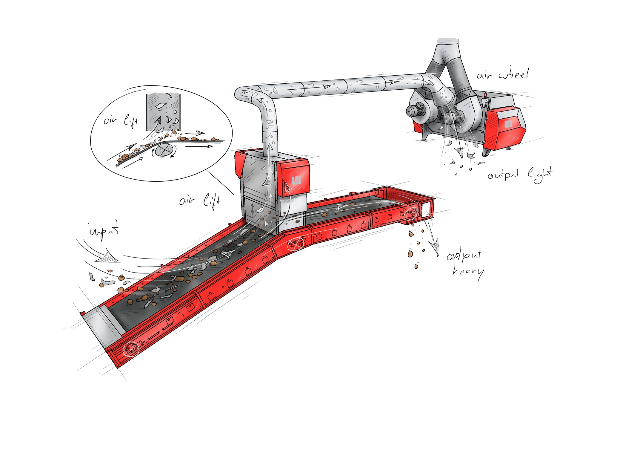 Die drei System-Komponenten: Airlift mit Hochgeschwindigkeits-Transportband Speedcon und Airwheel. Grafik: Westeria