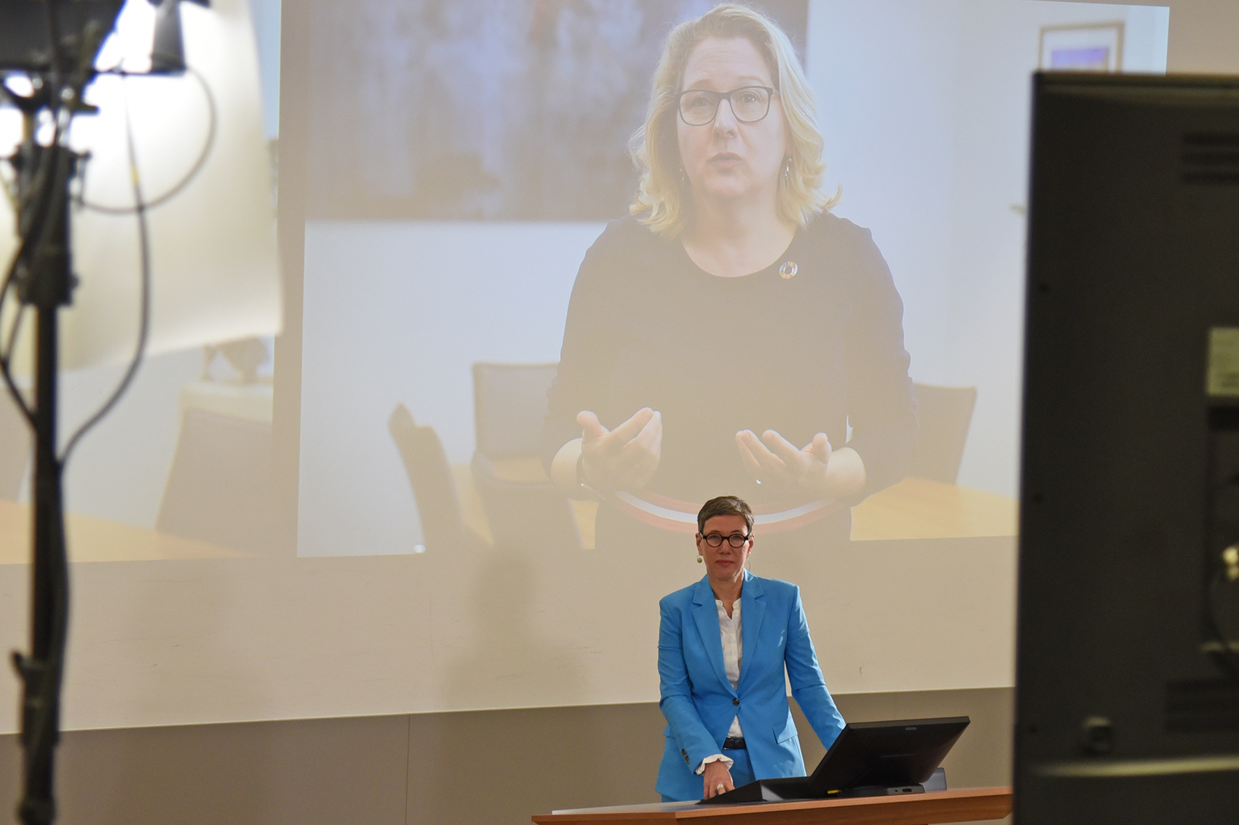 Prof. Dr.-Ing. Sabine Flamme, Vorstandssprecherin des IWARU, begrüßte die virtuell anwesenden Teilnehmer*innen der Kreislaufwirtschaftstage Münster, für die auch in diesem Jahr Bundesumweltministerin Svenja Schulze die Schirmherrschaft übernommen hat. (Foto: FH Münster/Stefanie Gosejohann)