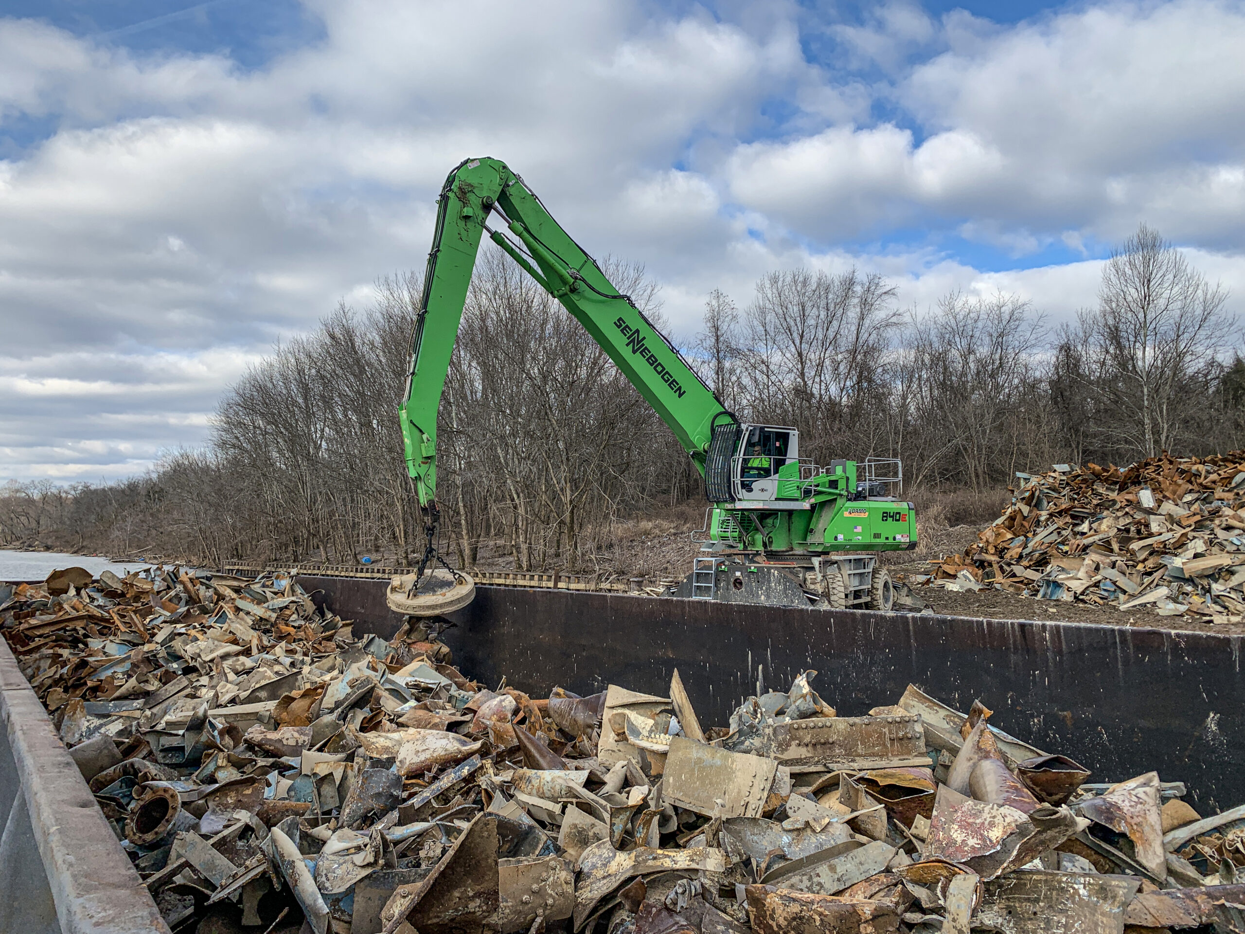 Der Sennebogen 840 E in der Mobilvariante unterstützt nun mit Magnet Adamo Demolition in den USA beim Extrahieren von Metallschrott aus Bauschutt und verlädt diesen in Lastkähne. Bild: Sennebogen LLC