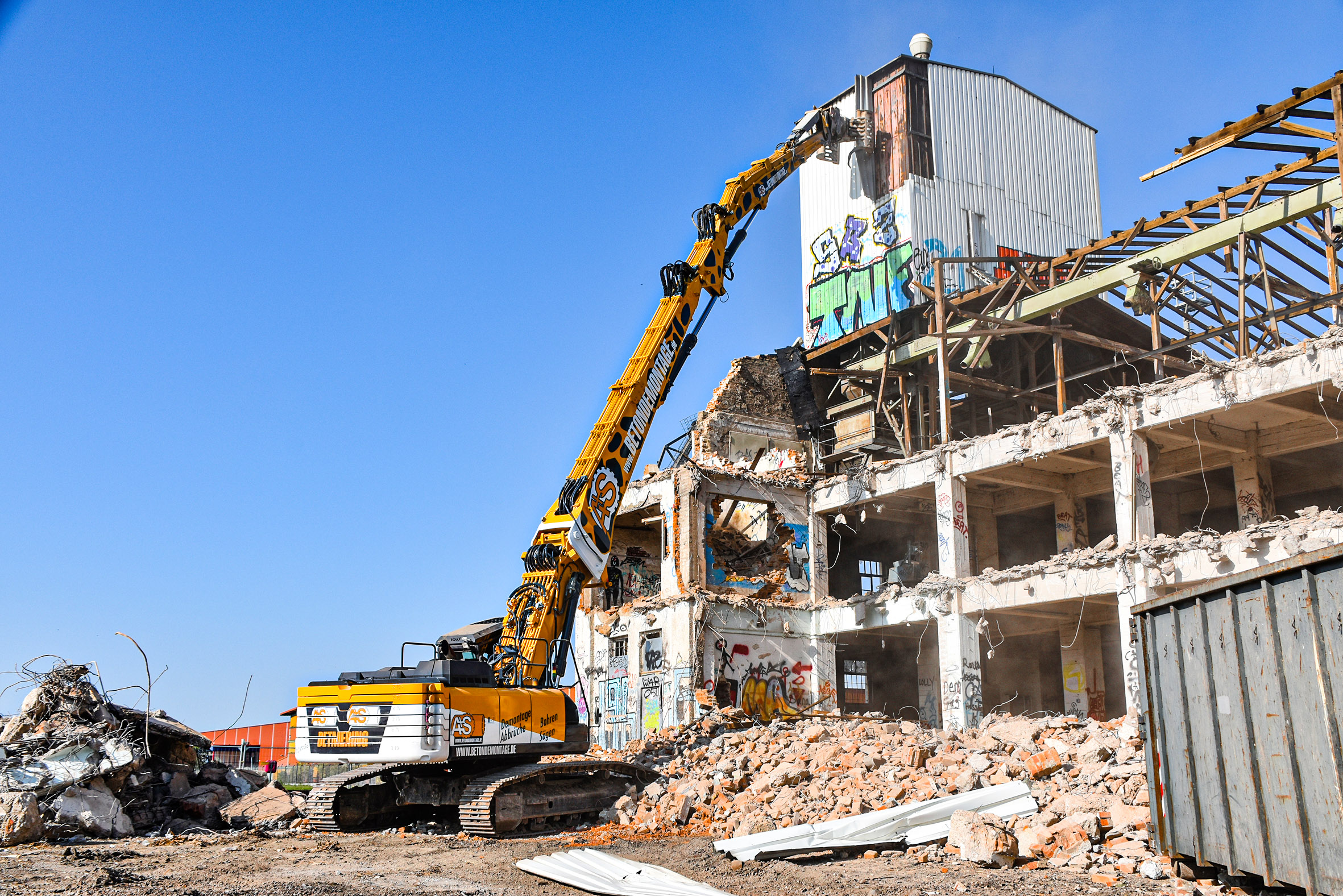 Ein erfahrener Maschinenführer pellt mit dem KMC 400 in über 20 Metern Höhe die Blechverkleidung ab, als würde er eine Banane schälen. Bild: KTEG
