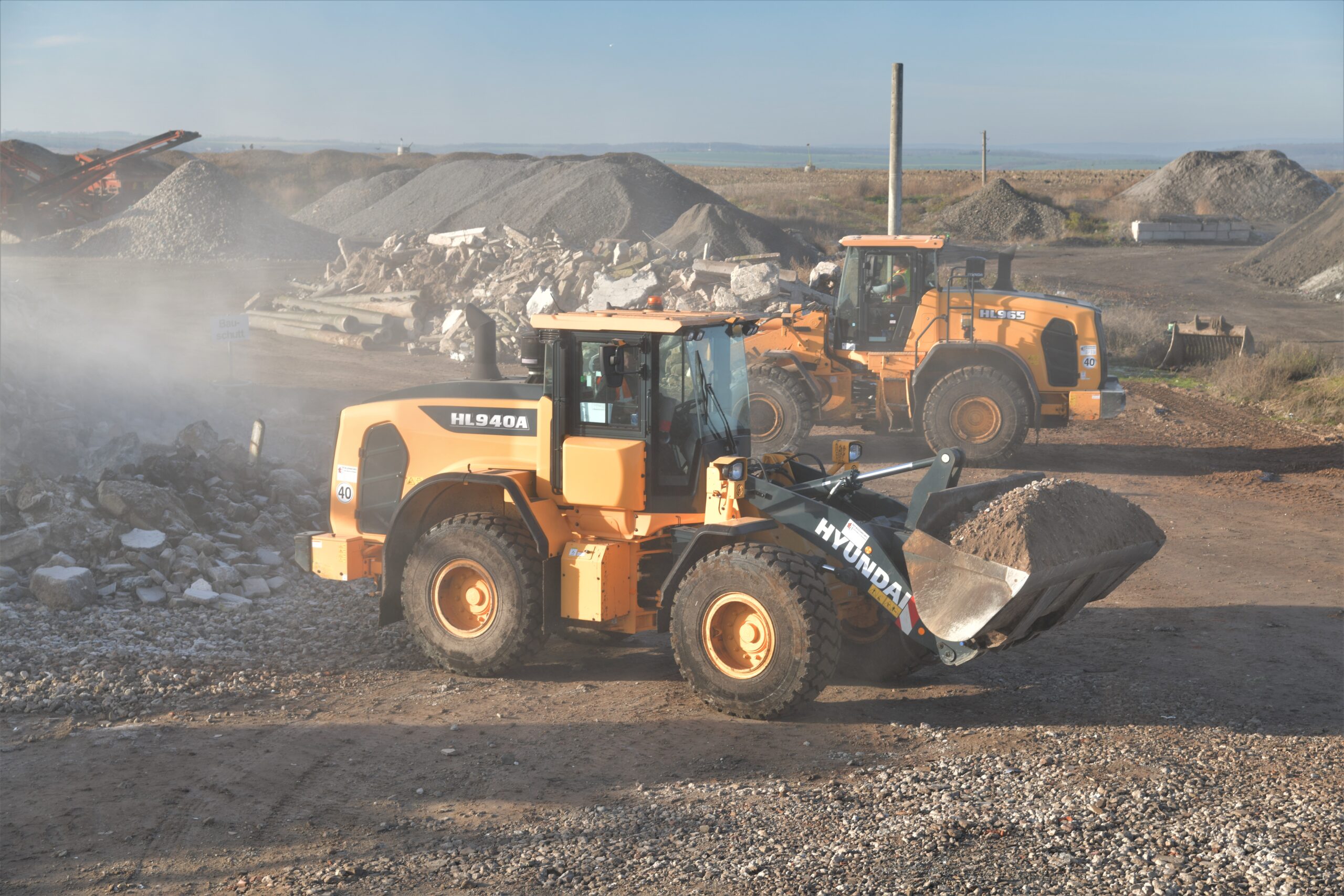 Die zwei Hyundai-Radlader HL965 und HL940A bei USUM Recycling in Steigra beim Sortieren und Verladen von Recyclingmaterial. Bild: Hyundai Construction Equipment Europe