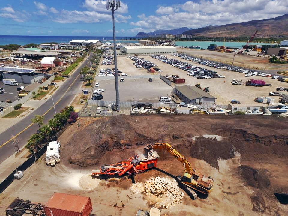 Brechen von Korallengestein mit dem Rockster Prallbrecher R700S auf dem 3 Hektar großen Recyclinghof von Alakona Corp in Honolulu. Im Hintergrund der Pazifik. Endfraktionen 32/72 vom Haldenband und 0/32mm vom Sandband. Bild: Alakona Corp