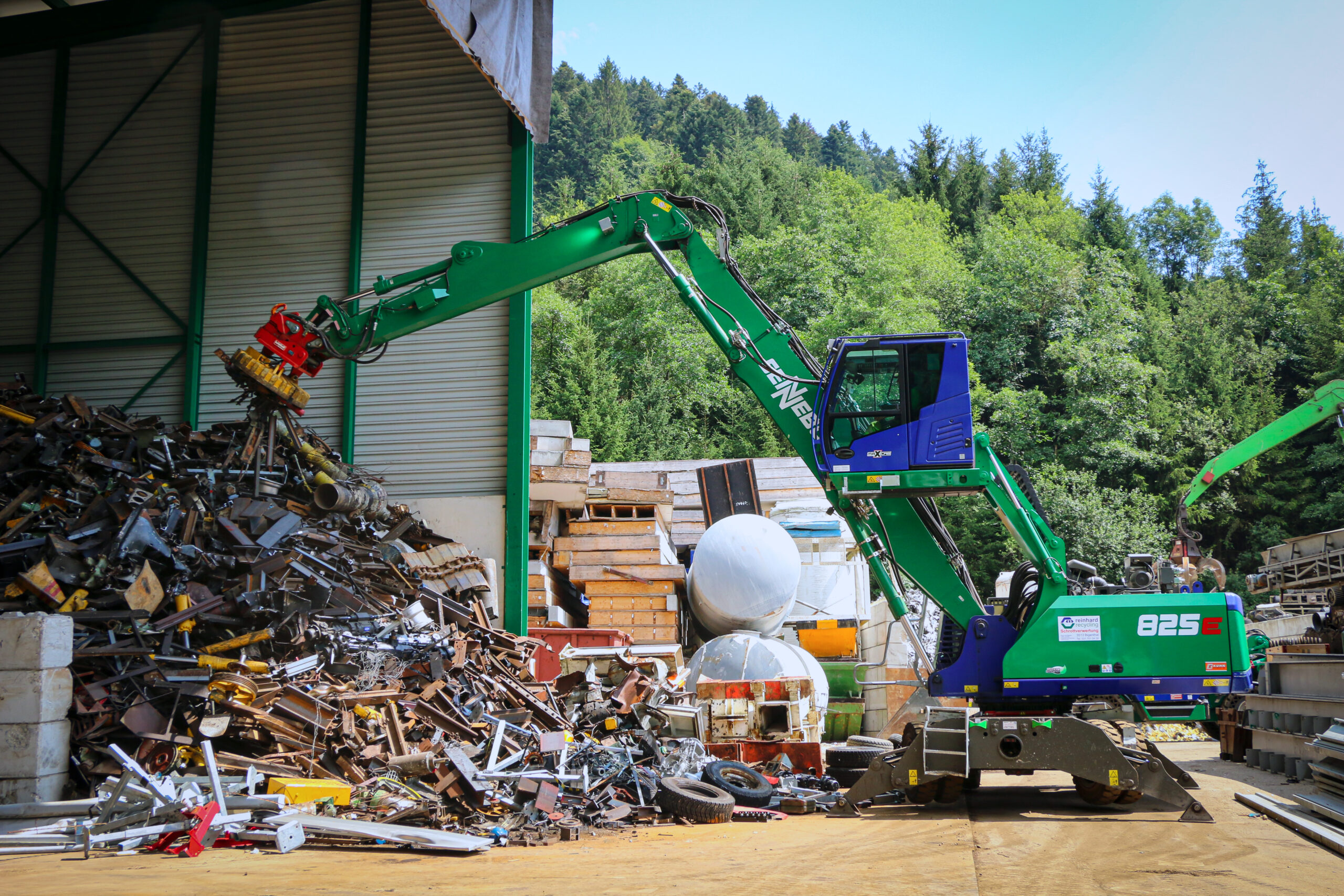 Umschlagmaschine Sennebogen 825 E Mobil: Flexibel einsetzbar mit Magnet und Sortiergreifer dank Schnellwechsler am Stiel. Bild: Sennebogen