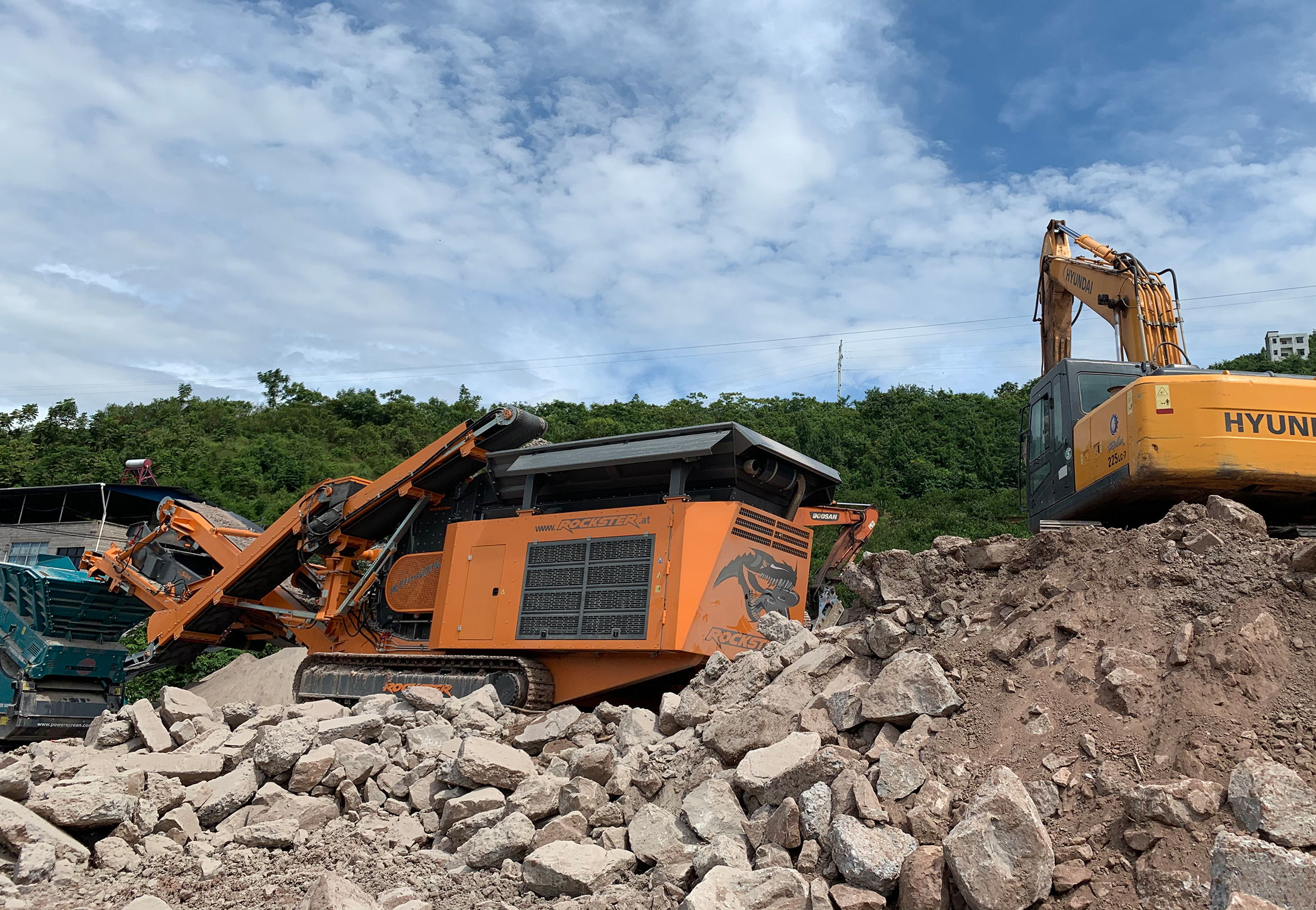 Rockster R1100DS in China: Aufgabematerial Granit mit bis zu 1000mm Durchmesser. Feines, erdiges Material wird durch die Vorabsiebung und das Seitenaustrageband entfernt, noch bevor es in die Brechkammer gelangt. Bild: Rockster