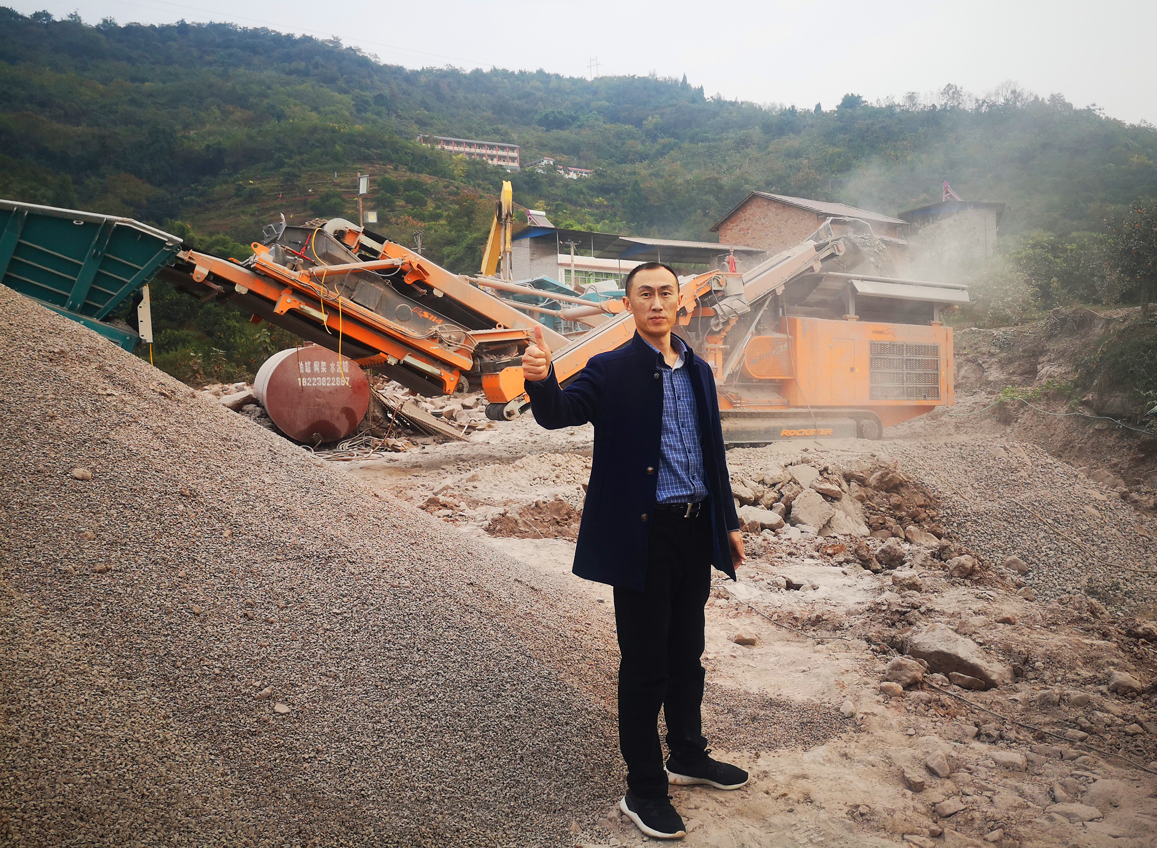 Ran Maohe, Geschäftsführer von Kebao Construction Machinery Leasing, vor seiner neuen 37 Tonnen Rockster Prallbrechanlage R1100DS in Chongqing China. Bild: Rockster
