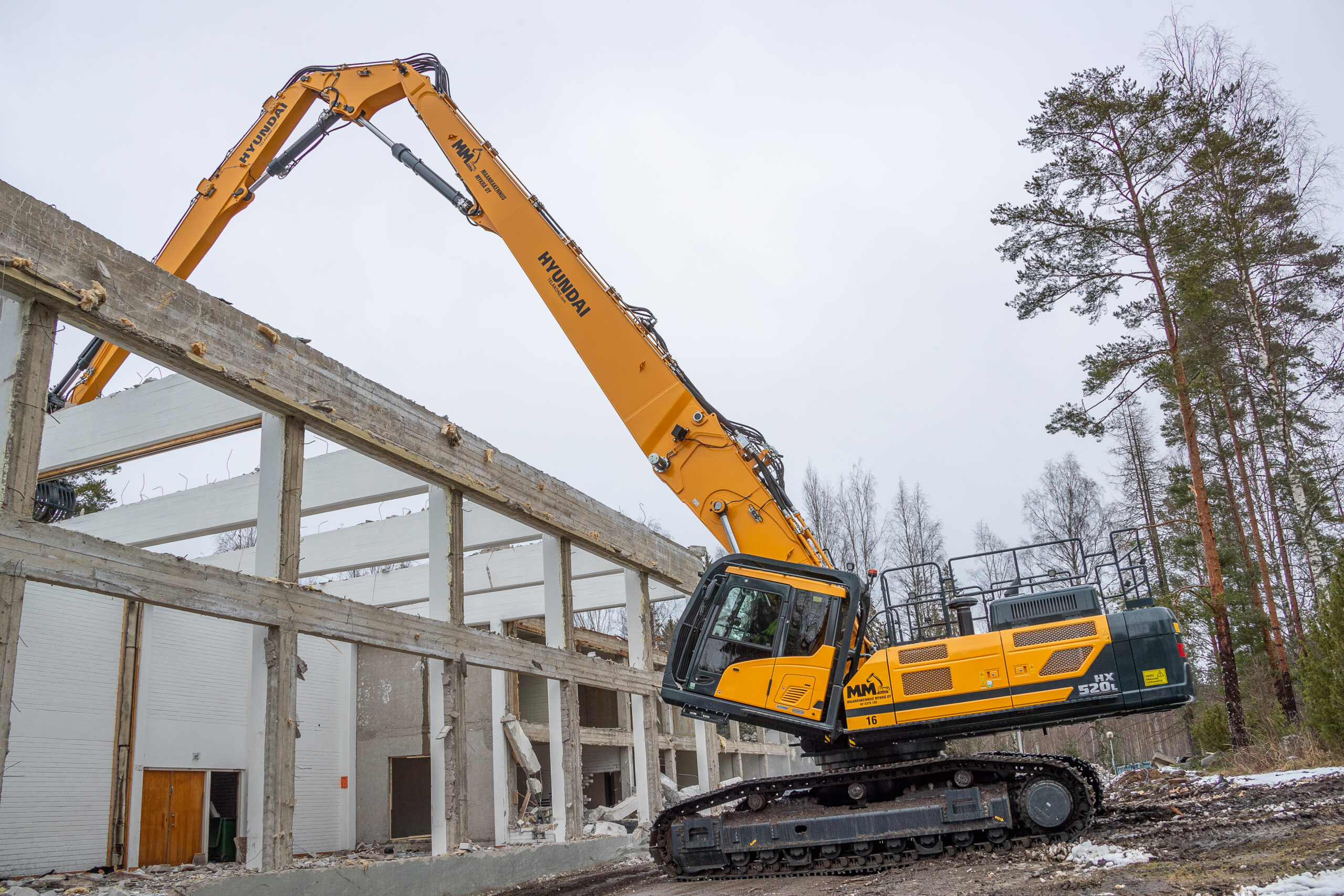 Typischer Einsatz mit dem 28 m langen dreiteiligen Ausleger – Arbeiten über eine Gebäudekante hinweg. Weitere Sonderausstattung ist die kippbare klimatisierte Kabine, damit der Bediener auch bei ausgestreckter Arbeitsausrüstung bequem arbeiten kann. Bild: Hyundai
