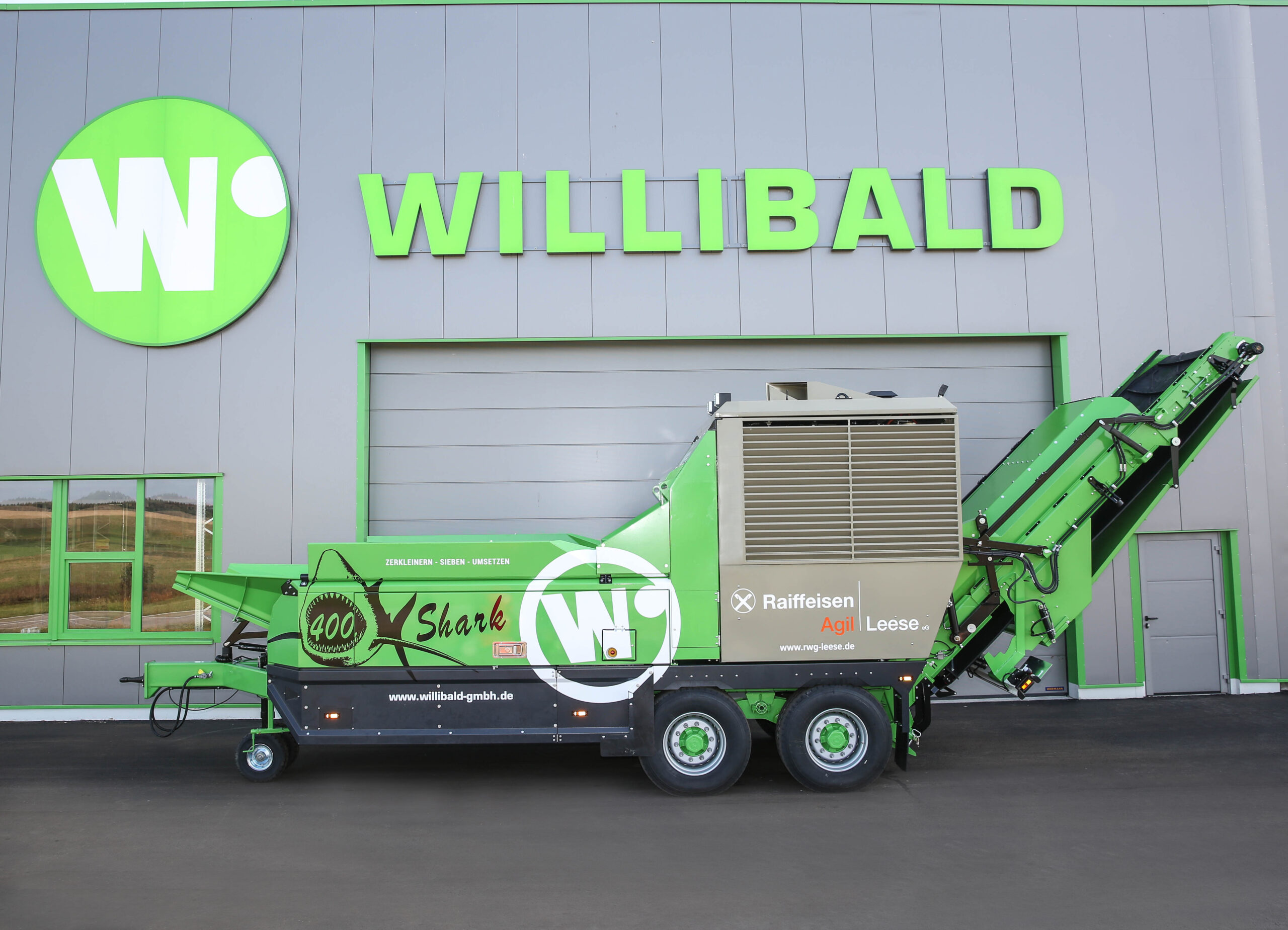 Der 400. mobile Willibald Zerkleinerungs-Schredder „EP 5500 Shark“ nach der Fertigstellung mit Jubiläums-Sonderbeklebung für den Kunden Raiffeisen Agil Leese eG. Bild: J. Willibald GmbH