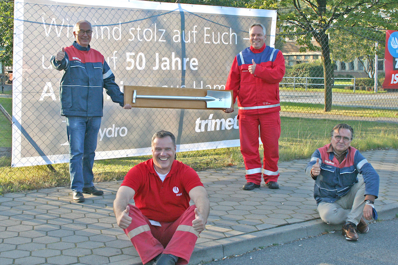 Die Werksleiter Jörg Prepeneit von Trimet und Jan Peterlic von Hydro (hinten, v. l.) und die Betriebsratsvorsitzenden Michael Ecker (Hydro) und Bernd Siemon (Trimet) (vorne, v. l.)